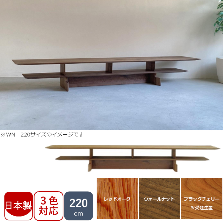 天然木本来の味わいを存分に生かしたTVボード。無垢材を使用し、高級感のあるデザインです。エッジの効いた天板は、全体をシャープな印象にしています。オープンな収納は熱がこもりにくく、すっきりシンプルで軽やか。安心の日本製クォリティー、機能性とデザイン性を兼ね備えたおススメのTVボードです。質感と機能性に優れた、使って安心の国産TVボードです。