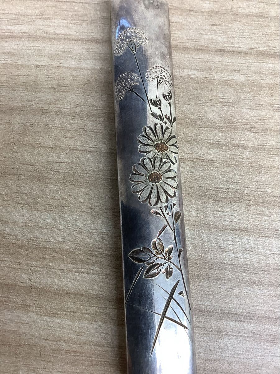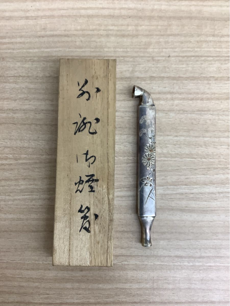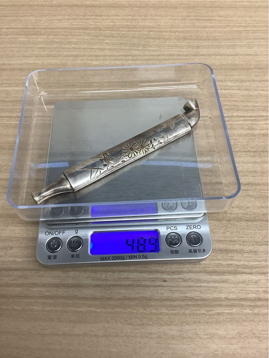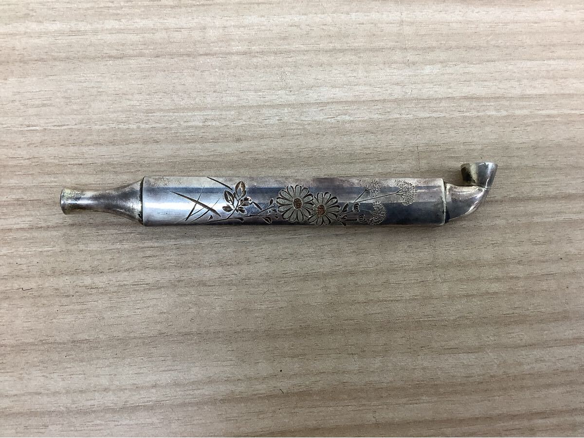 純銀 延煙管 キセル 銀細工 花彫刻 シルバー 金属工芸 共箱有 本体重量48.9g 喫煙具 現状品