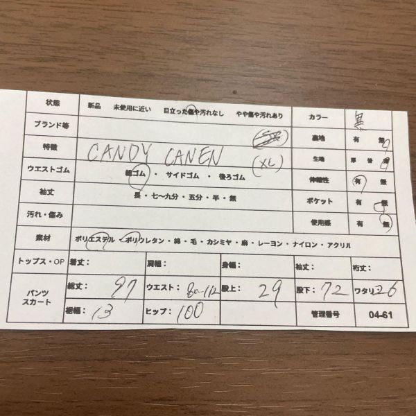 ストレッチ素材で快適♪キャンディケーン柄がかわいい遊び心あるパンツ - ブランド:CANDY CANES - サイズ表記:XL - 素材:ポリエステル、ポリウレタン - カラー:黒地×赤キャンディケーン柄 - シーズン:秋冬 - 服の特徴:総ゴム仕様、ストレッチ素材、キャンディケーン総柄デザイン 管理番号: 04-61 即購入大歓迎・お得な割引各種あります 詳しくはプロフィールをご覧ください! 匿名&送料無料 海外輸入のため全て一点ものです 古着のため使用感・毛玉等があることもあります。写真で状態の確認を行なってからご購入ください おまとめ買いでお得な割引あります♪ 平置き採寸表→写真から確認いただけます! (素人採寸のため、多少の誤差はご了承ください) 商品状態に関しては、写真、商品説明欄に記載しております。着用回数、購入時期などはお答えできませんので、ご了承ください。着画、写真の追加もお断りしております。 簡易包装のコンパクト発送となります。 畳みシワはご了承の程、宜しくお願いいたします。 商品によっては圧縮してお送りするものもございます。 撮影環境や使用するモニター、反映されにくい色味など、 商品と画像に若干の色誤差が生じますことをご了承ください。 出品作業の際にしっかりと確認はしておりますが、シミなどの見落としがある場合もございますのでご了承下さい。 古着の取り扱いになりますので特有の匂い等がある可能性があります。ご理解のある方のみご購入の程お願い致します。