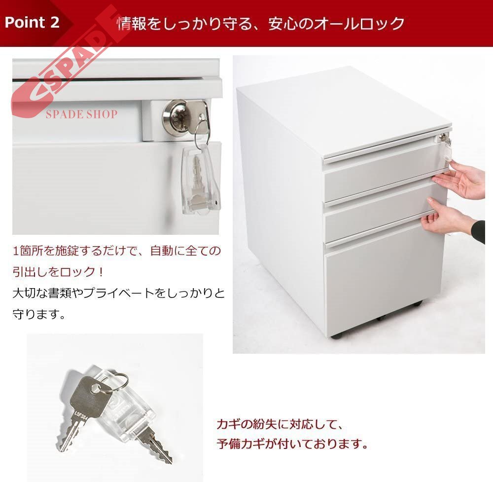 • 【POINT 3 安心のオールロック】1箇所を施錠するだけで、自動に全ての引出しをロック! 大切な書類やプライベートをしっかりと守ります。 カギの紛失に対応して、予備カギが付いております。