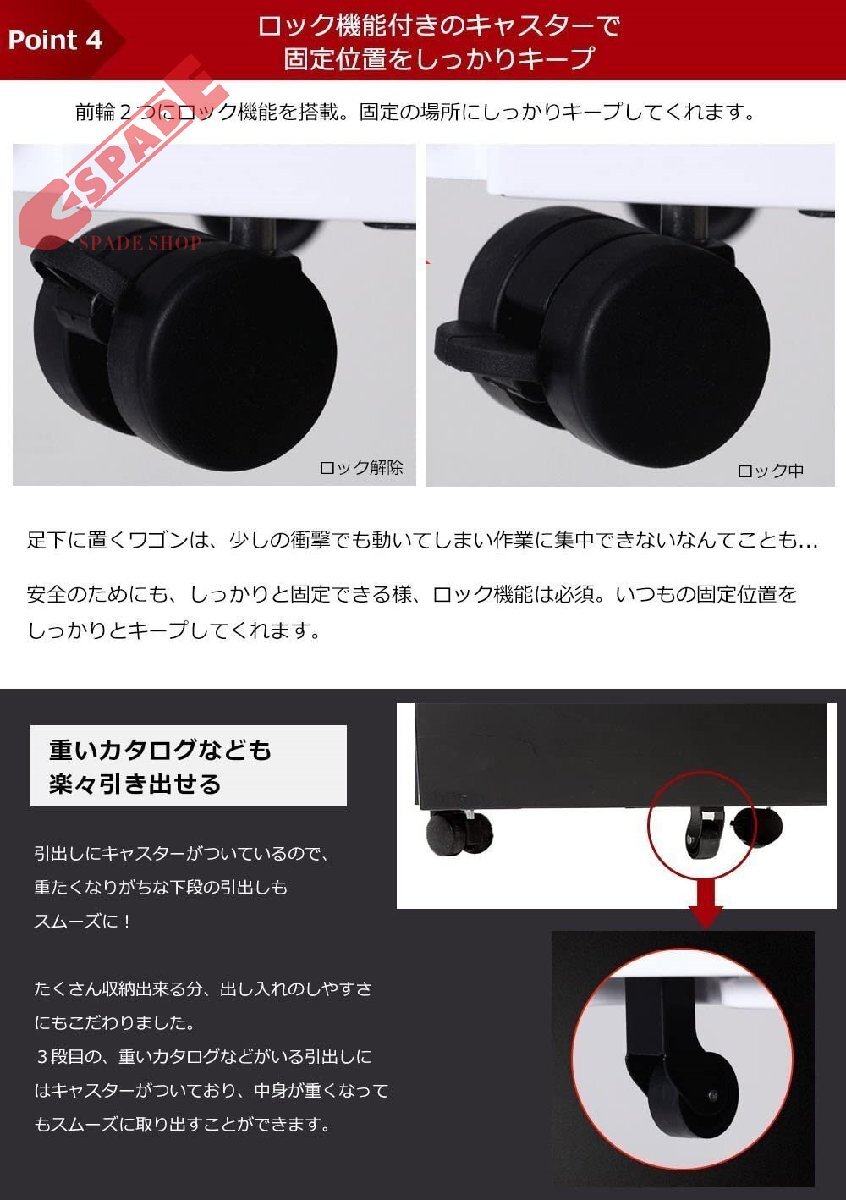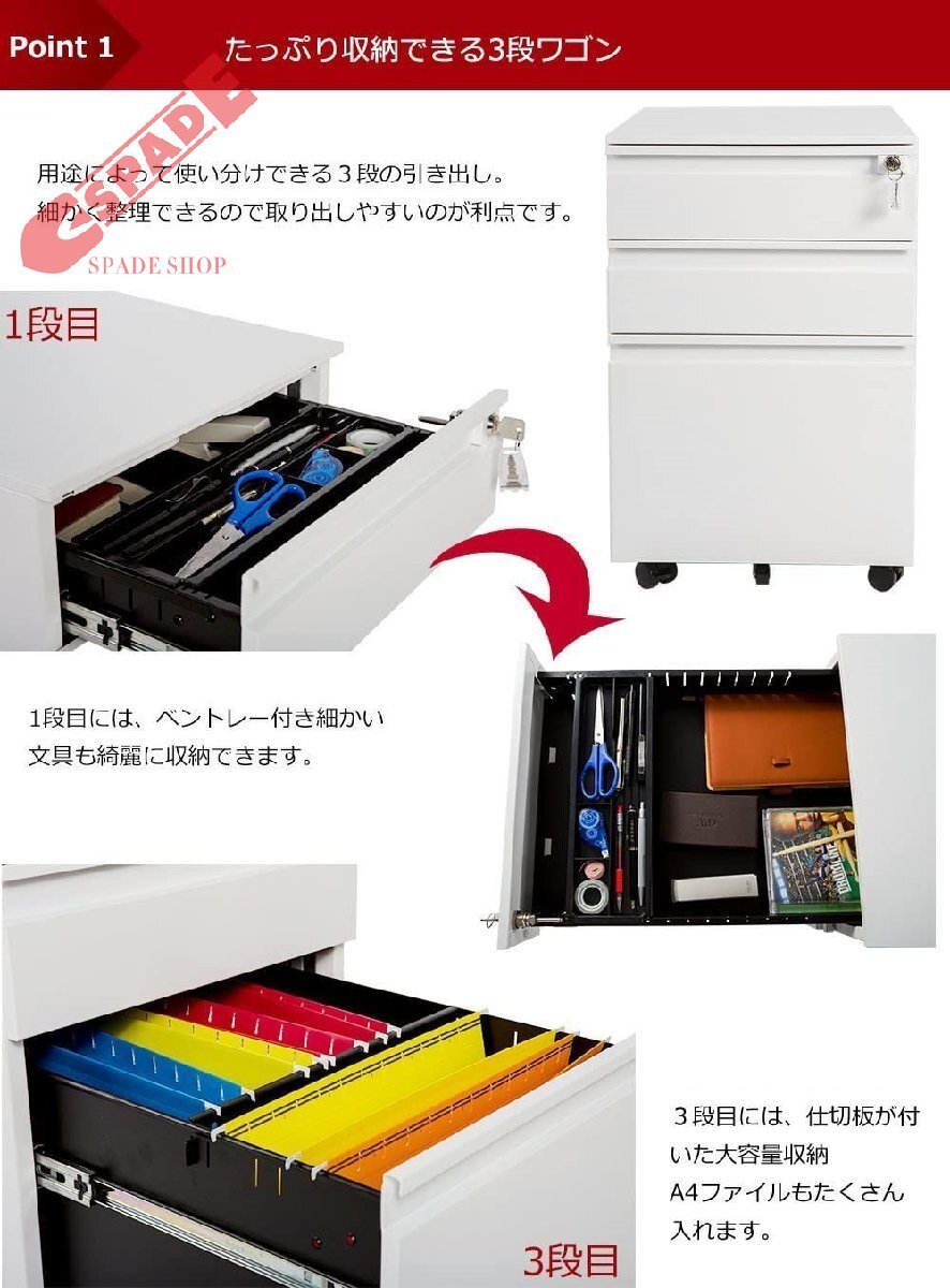 • 【POINT 2 たっぷり収納できる、3段ワゴン】用途によって使い分けできる3段の引き出し。 細かく整理できるので取り出しやすいのが利点です。 1段目には、ペントレー付き細かい文具も綺麗に収納できます。 3段目には、仕切り板が付いた大容量収納A4ファイルもたくさん入ります。