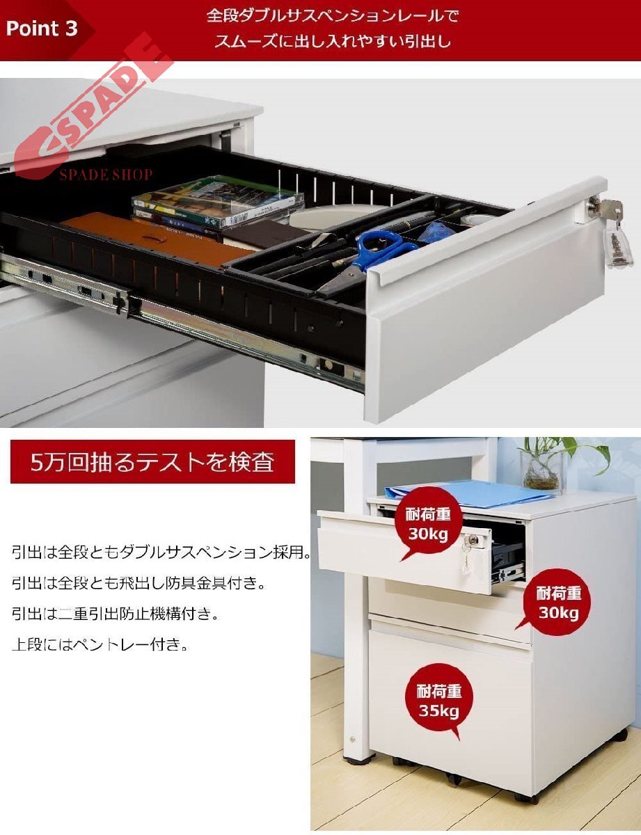 • 【POINT 4 全段ダブルスライドレール】引き出しは、スライドレールを使用、安定性と静音性が抜群。 軽い力で簡単にスライドができます。 資料など入れても、引き出す時に、うるさくありません。