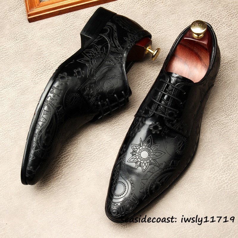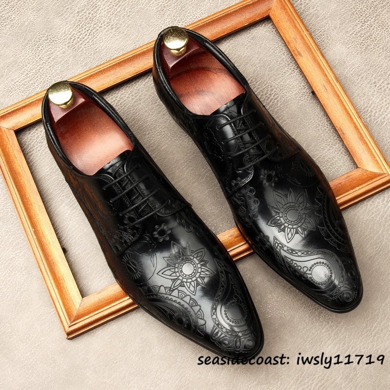 定価11万超★最高級 ビジネスシューズ 本革 レザーシューズ 超希少 職人手作り 総柄 牛革 紳士靴 メンズ フォーマル 革靴 ブラック 24.5cm