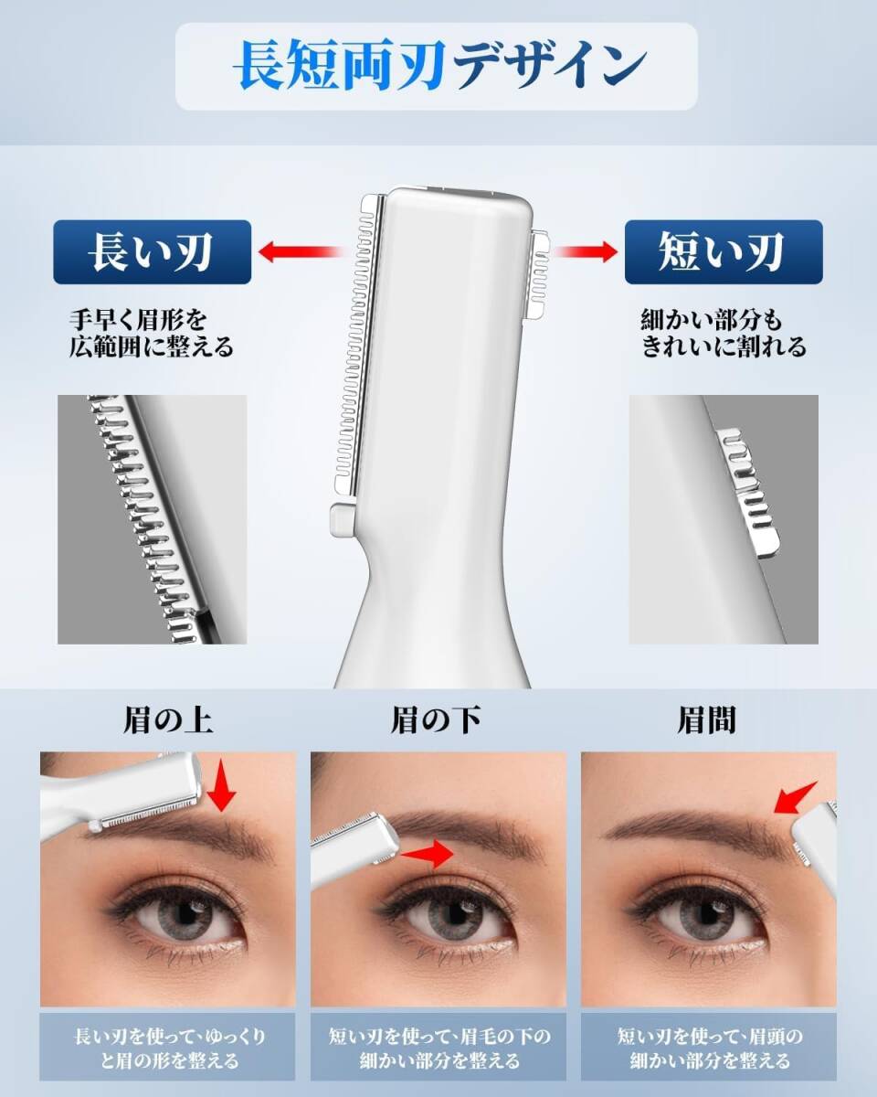 • 【R型鈍角刃先のエッジデザイン保護】眉剃刀は、優しいR型鈍角の円形刀頭設計を採用しており、肌に直接触れず、肌に優しいです。余分な毛を優しくカットしながら、肌を守り、損傷を防ぎます。【2サイズの刃、剃り効率高い】2つのサイズの刃が搭載されており、長い刃は顔の余分な毛の処理に効率的で、眉のラインや顔のうぶ毛の処理に最適です。短い刃は眉毛の形を細かく整えることができます。