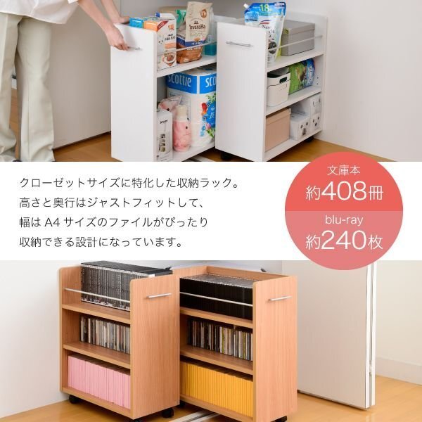 | キャスター付きの便利なクローゼットラック2個組。 取っ手はどちらにも取り付け可能なので、収納箇所の向きは左右入れ替えできます。 A4ファイルがぴったり収納できるよう設計された幅26.5cm。 本やメディア類や、日用品のストックなどの収納にぴったりです。 クローゼット内のスペースを有効活用できるのでお部屋をすっきり片付けられます。 |