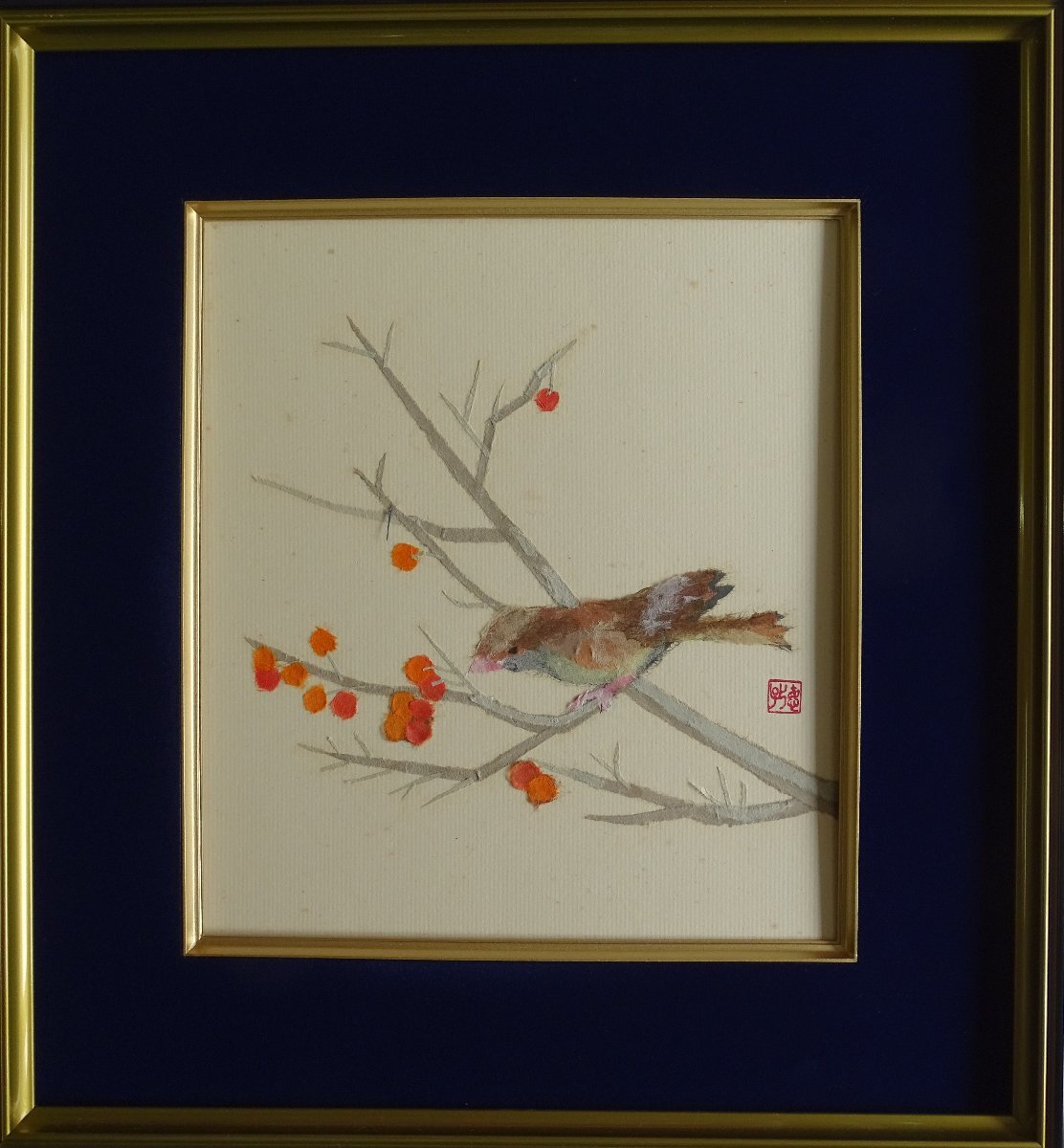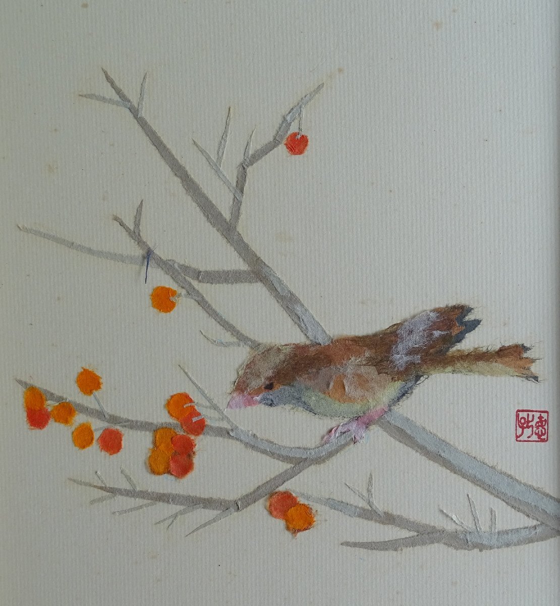 ・作者: 並川徳子 ・画題: 木の実に小鳥 ・技法: 和紙ちぎり絵 ・NO-R6-5-8.5