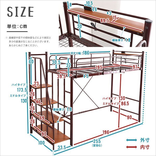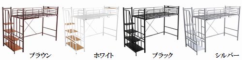 | 【ポイント】 ①収納スペース付きの昇り降りがしやすい階段付きロフトベッドです。 ②左右どちらでも設置可能な、宮棚&左右スライド式の2口コンセント付きです。 ③2段階の高さ調節(ハイ・ミドル)が可能です。 ④左右入れ替え可能な、衣類収納に便利なハンガーパイプ1本付きです。 |