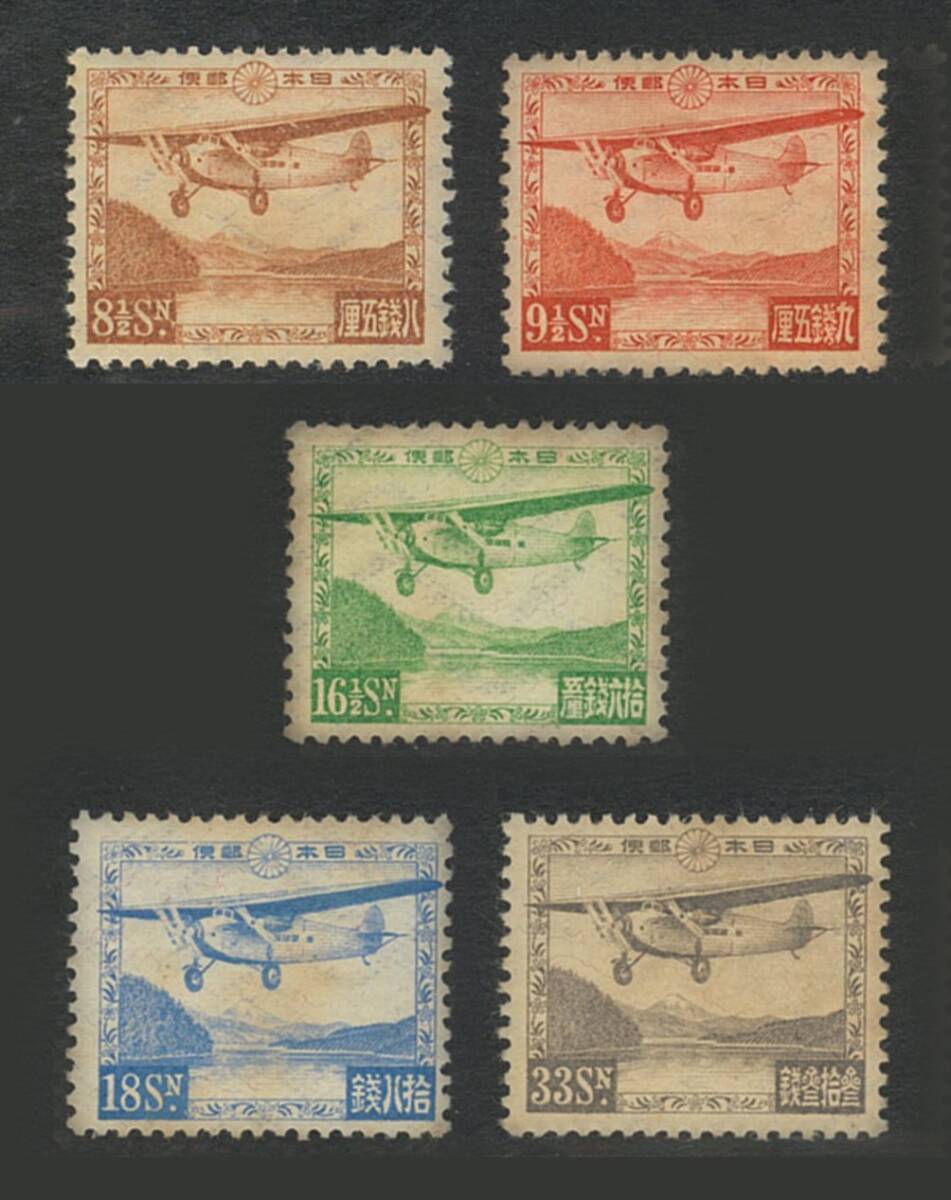 日本切手 1929年 芦の湖航空 単片5種 未使用