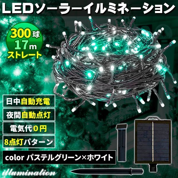 ソーラー イルミネーション 屋外 クリスマス ストレート 屋外用 イルミネーションライト 300球 パステルグリーン×ホワイト