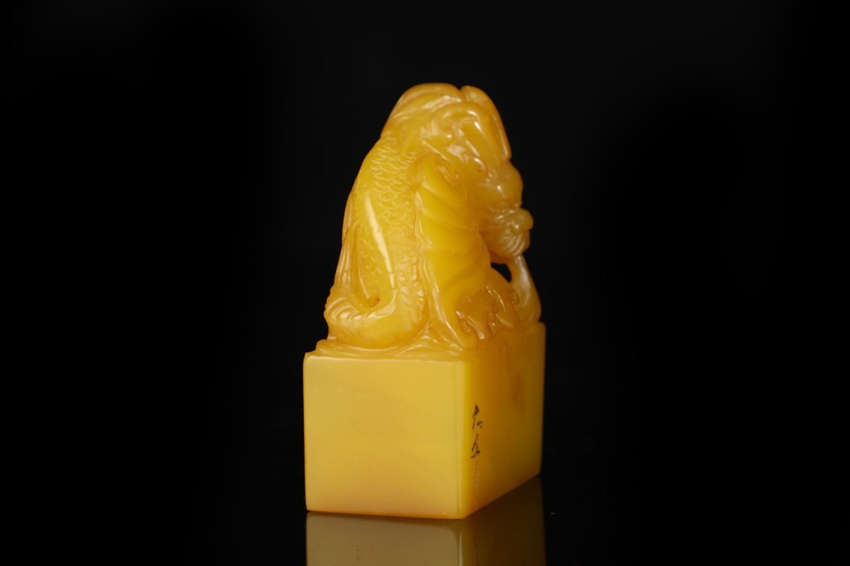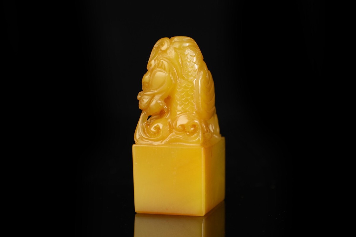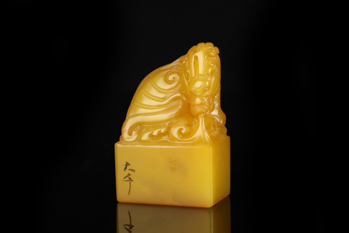【瓏】寿山石 田黄石彫 龍魚吐瑞印章 近時代 大千 極細工 手彫り 置物擺件 中国古賞物 古美術 蔵出
