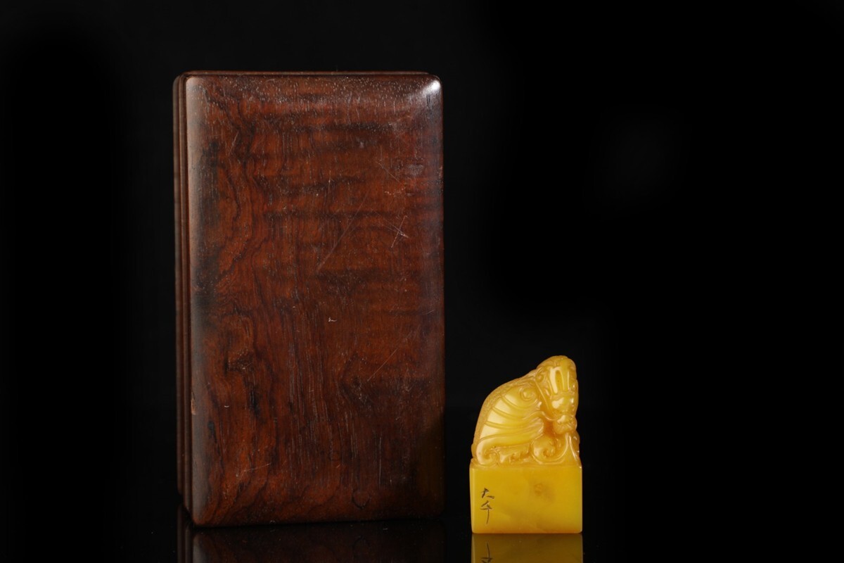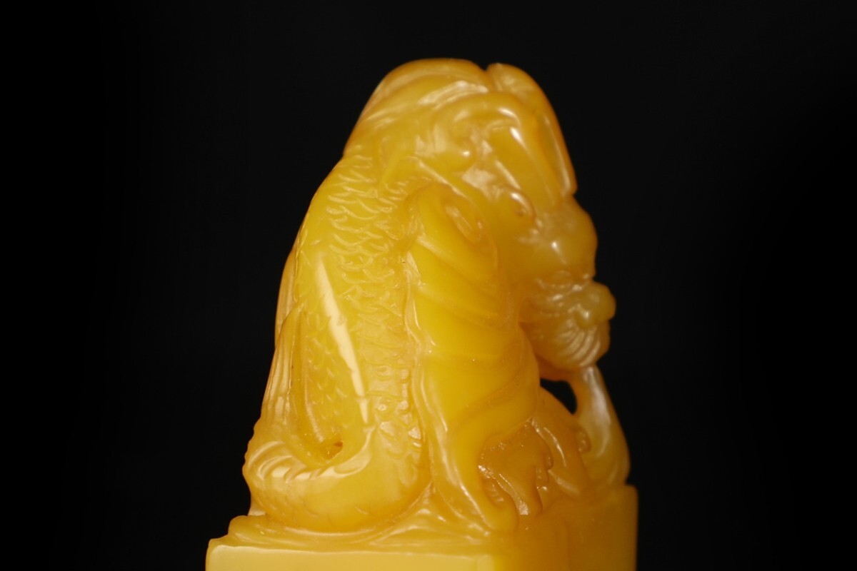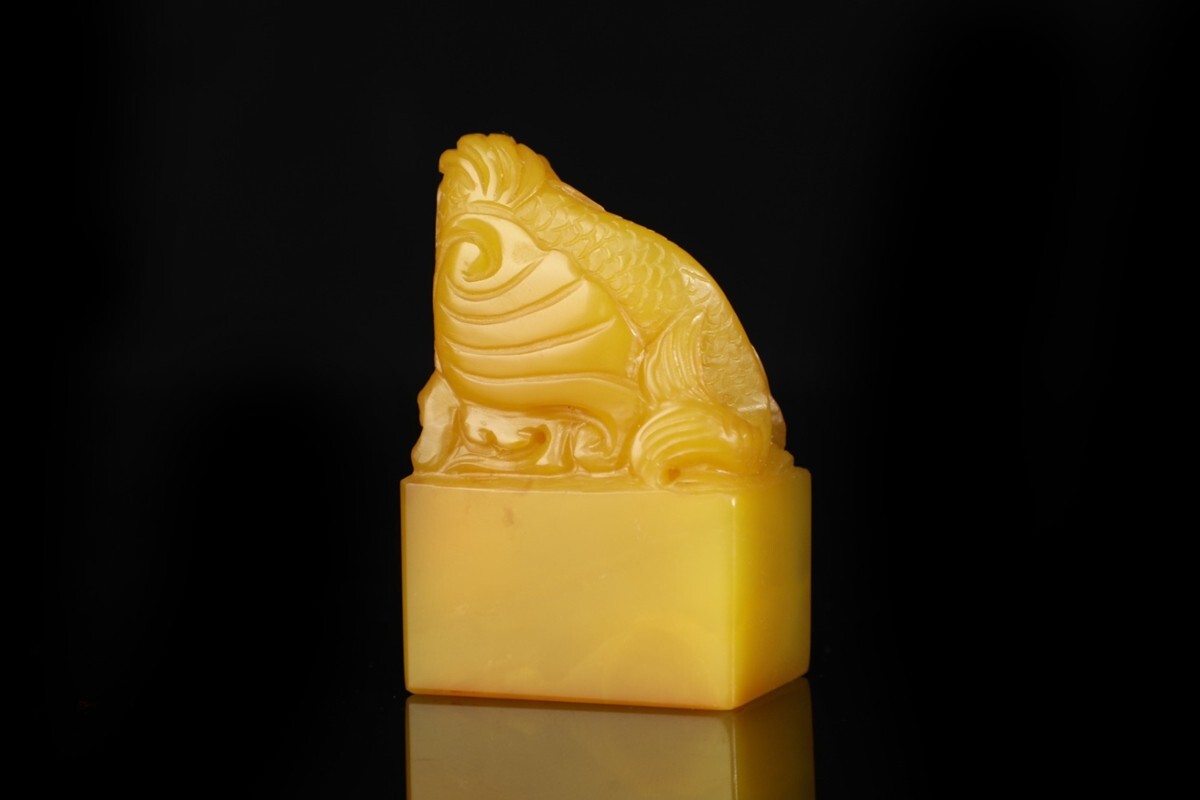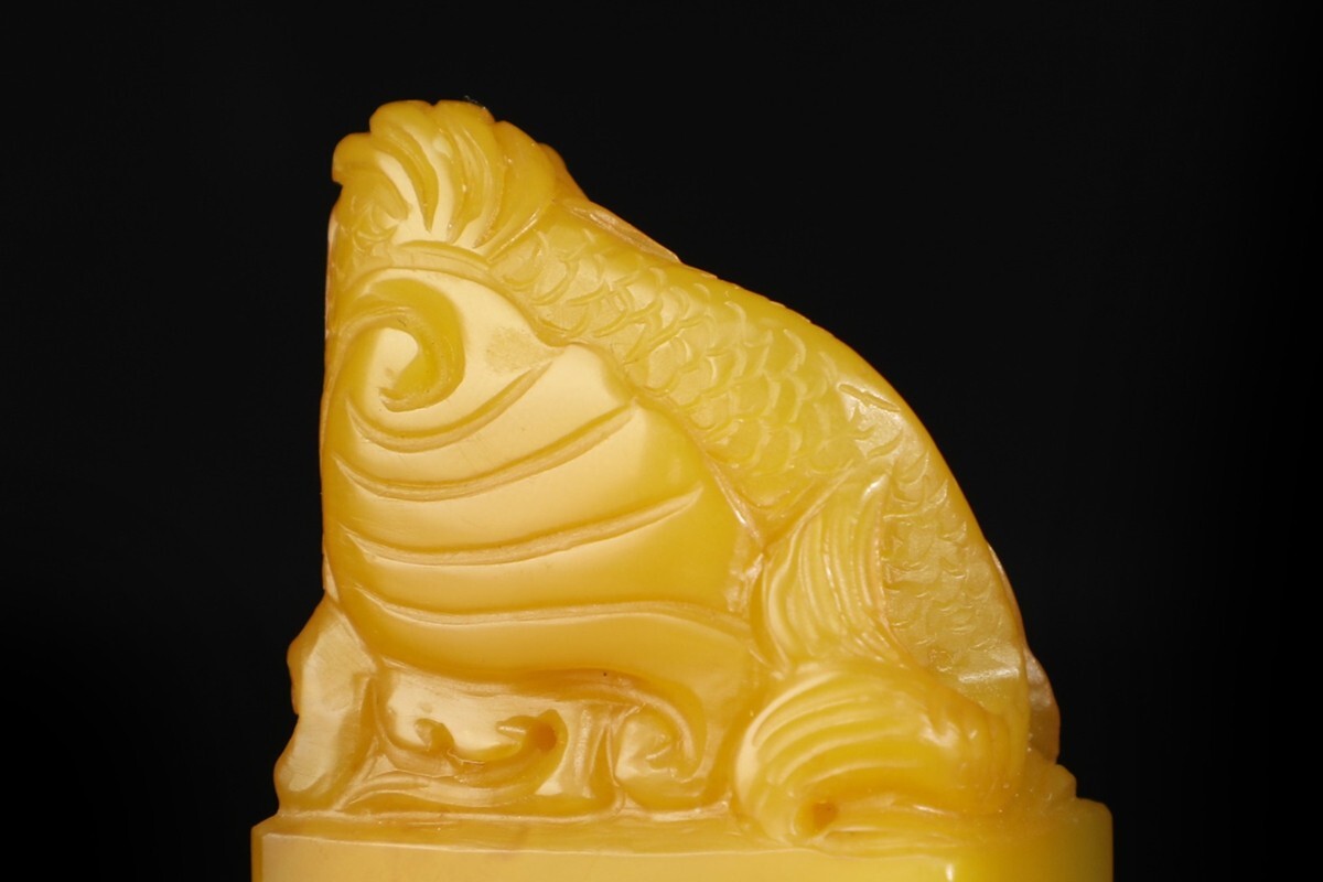 【瓏】寿山石 田黄石彫 龍魚吐瑞印章 近時代 大千 極細工 手彫り 置物擺件 中国古賞物 古美術 蔵出