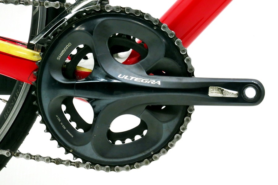 フレーム、その他外観:クランク、チェーンステー、リアディレイラー、シートステー、リアエンド、トップチューブ、シートチューブ、フォーク、クイック、ダウンチューブ、ヘッドチューブ、ステム、サドルレール、レバーなどに傷、ステムスペーサーの表面劣化、サドルに変色、バーテープ、レバーフードに傷み、ネジ、ナット、サドルレールに錆があり、使用感の強いお品でございます。