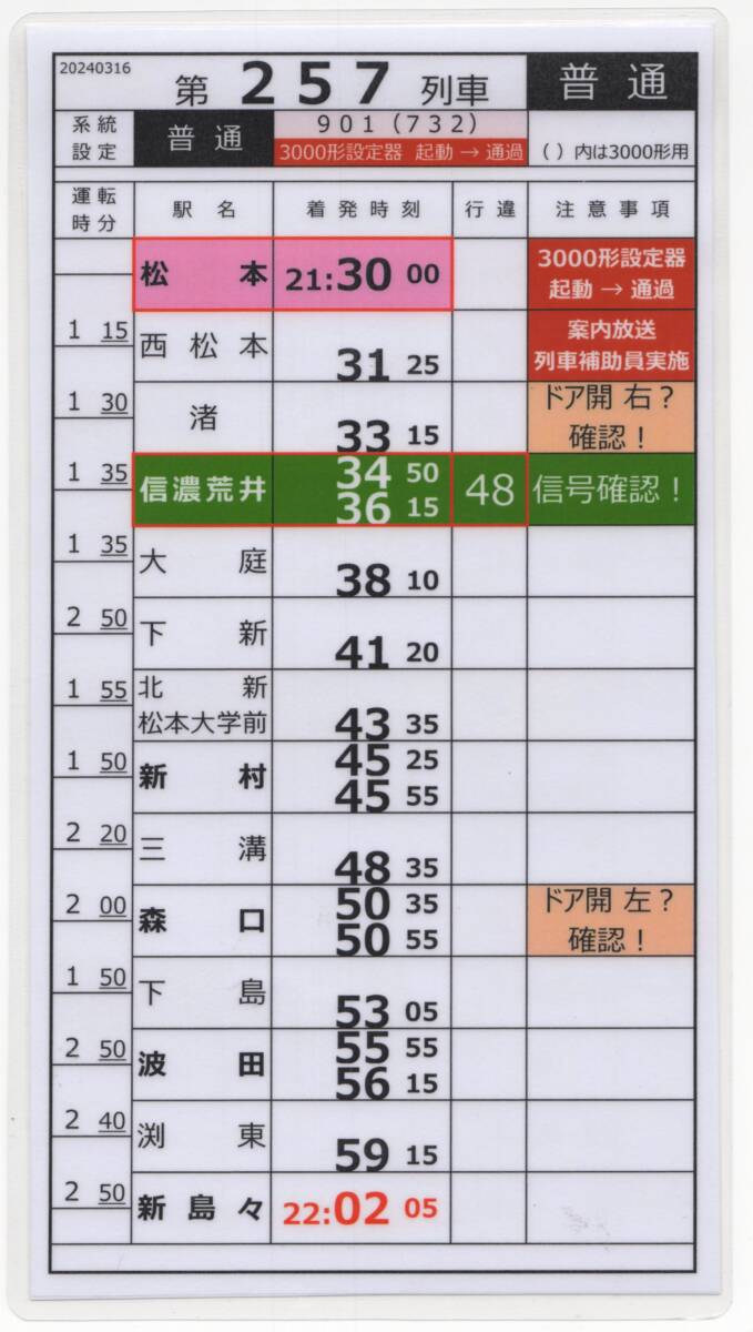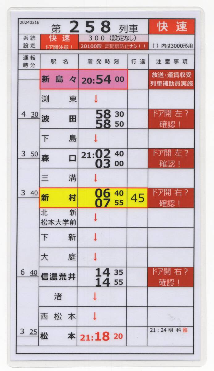 【アルピコ交通】運転士仕業表/第258列車(快速)・第257列車(普通)