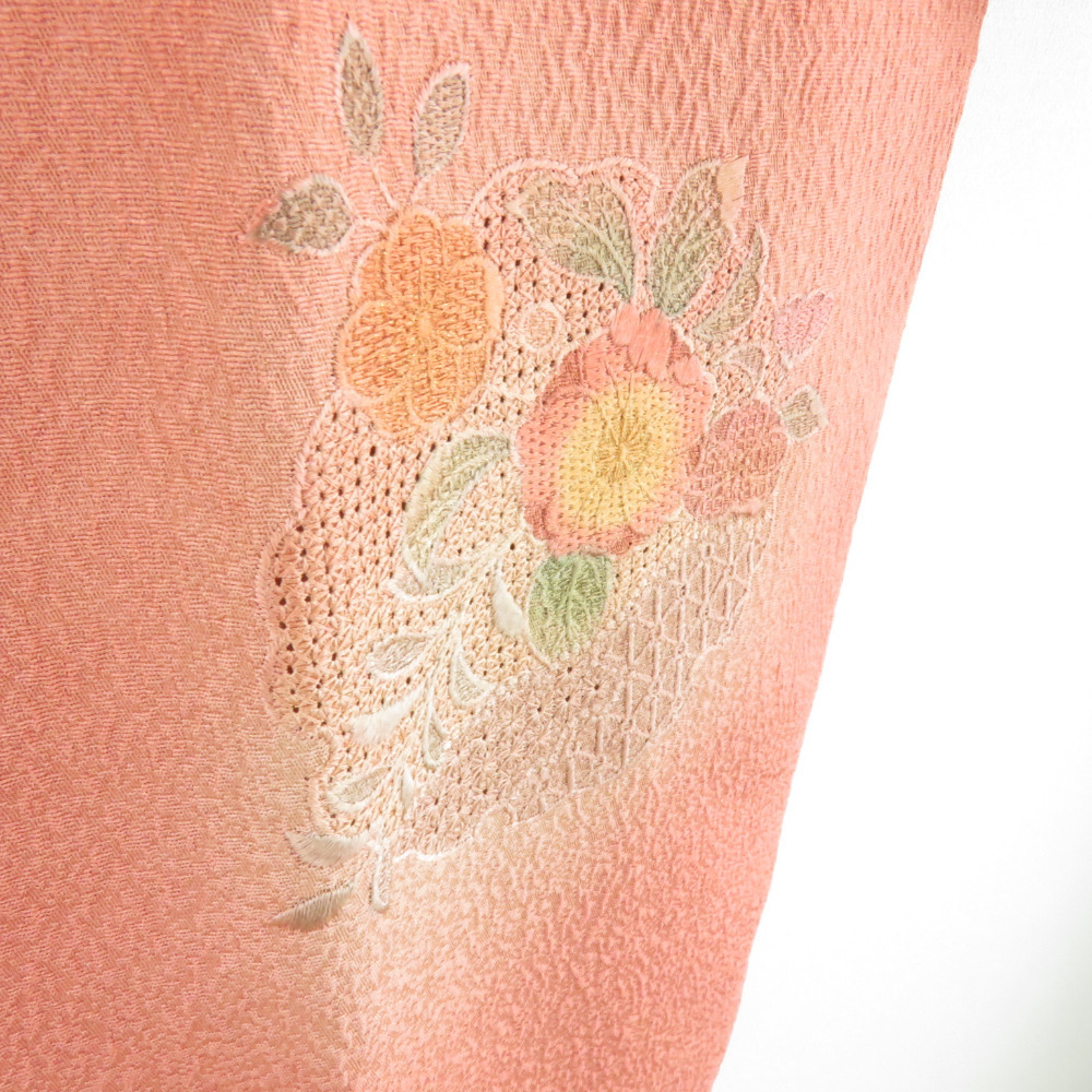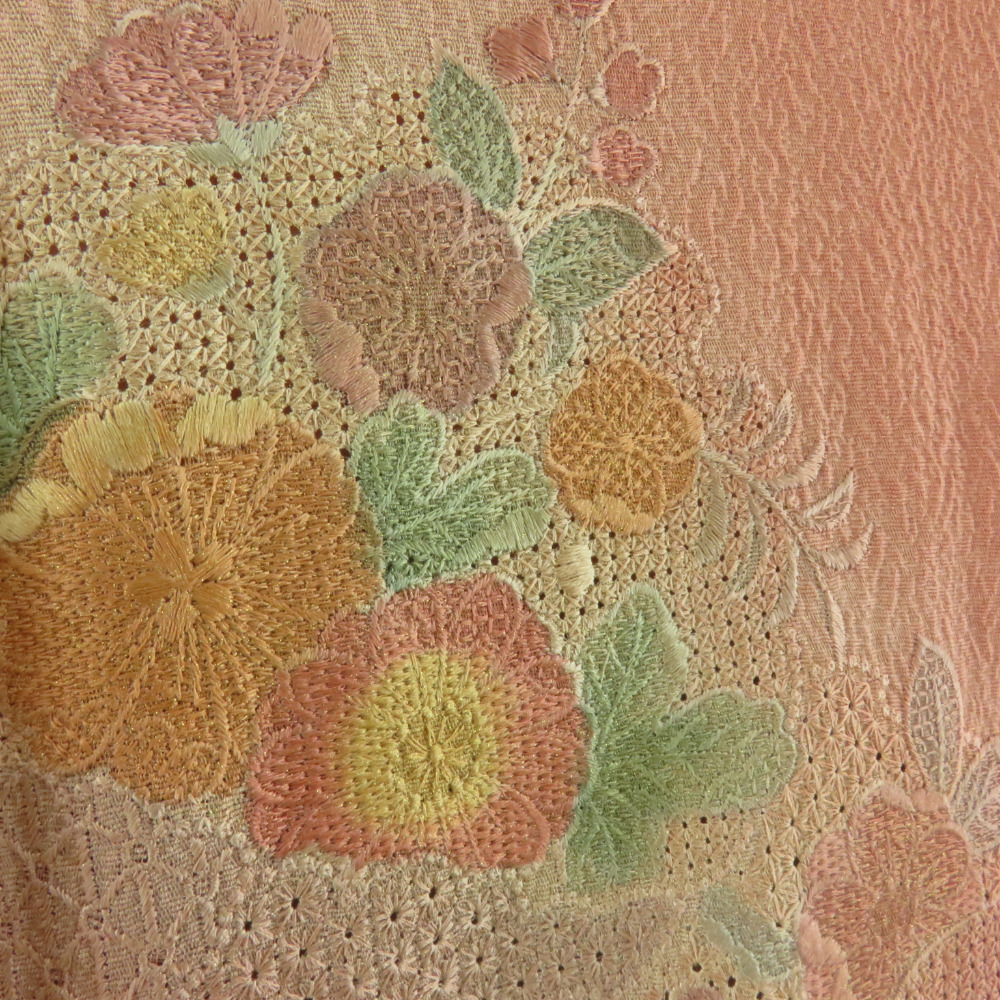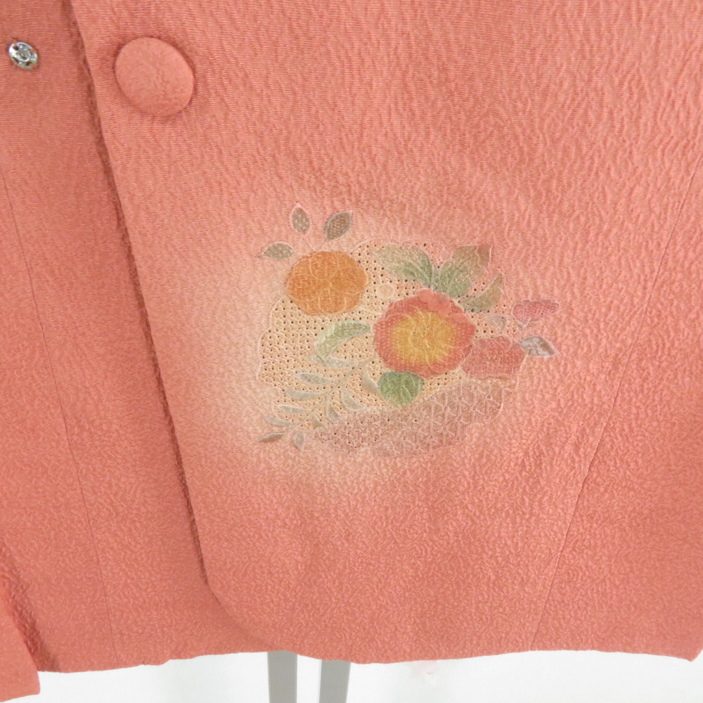 | 道行 汕頭刺繍 雪輪に花文様 橙茶色 正絹 着物コート 和装用 ちりよけ 身丈81cm |