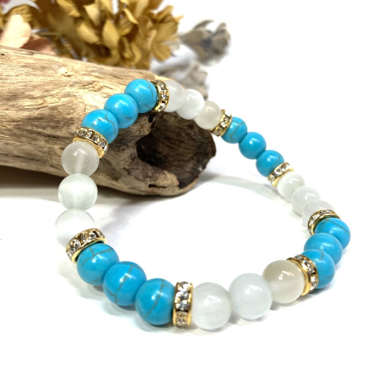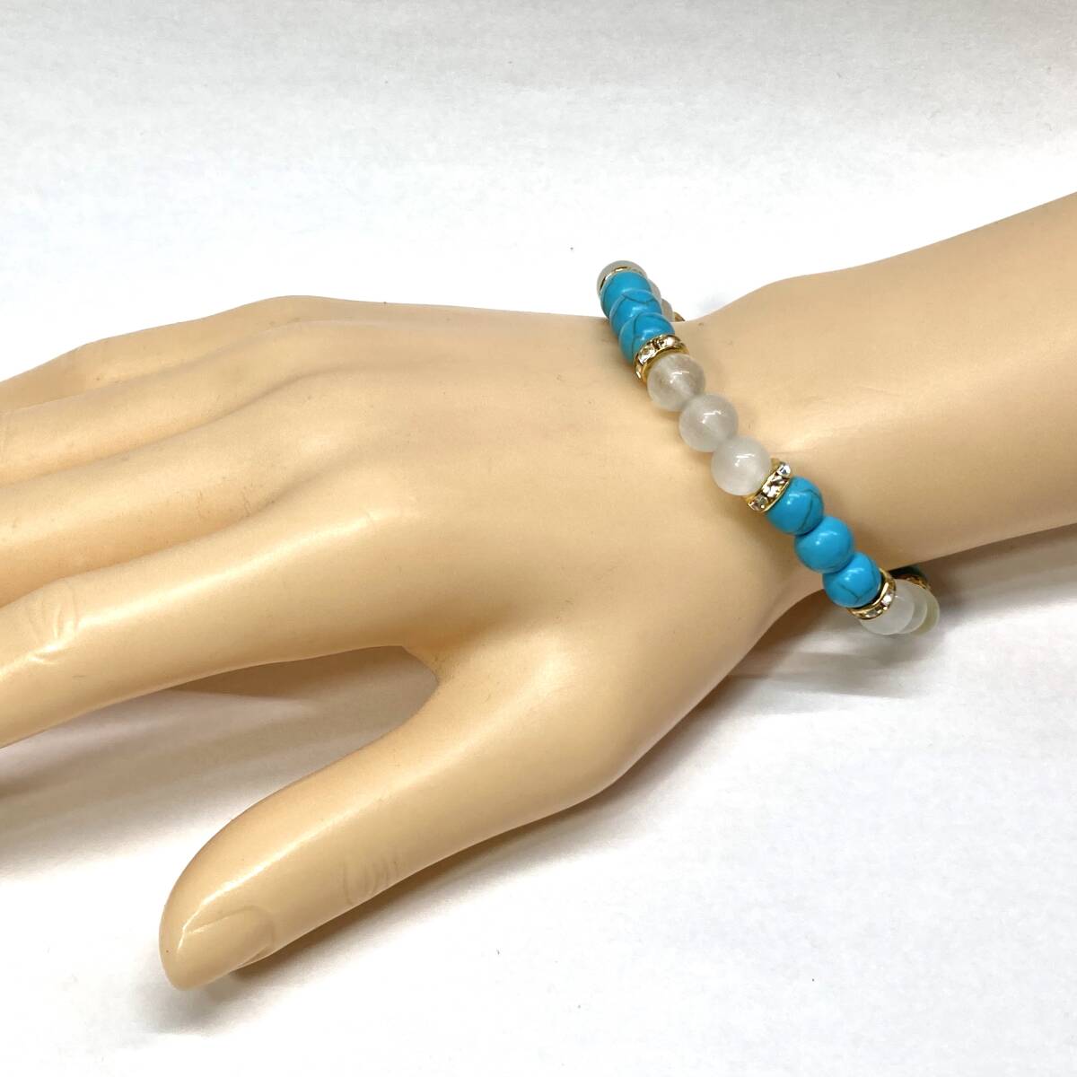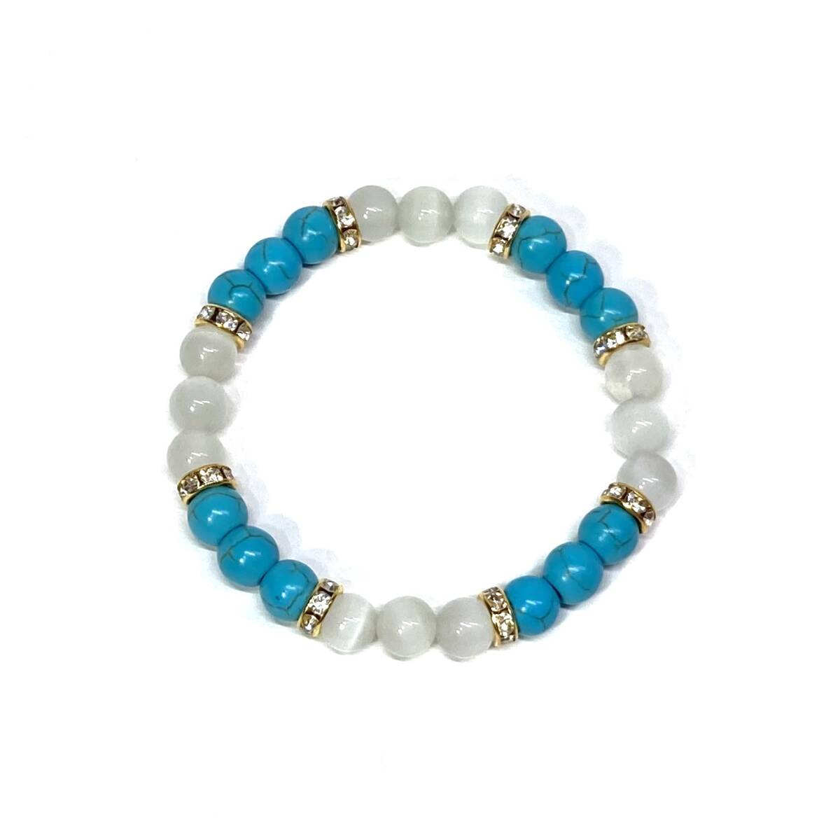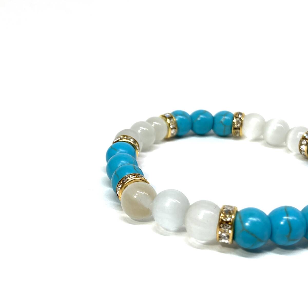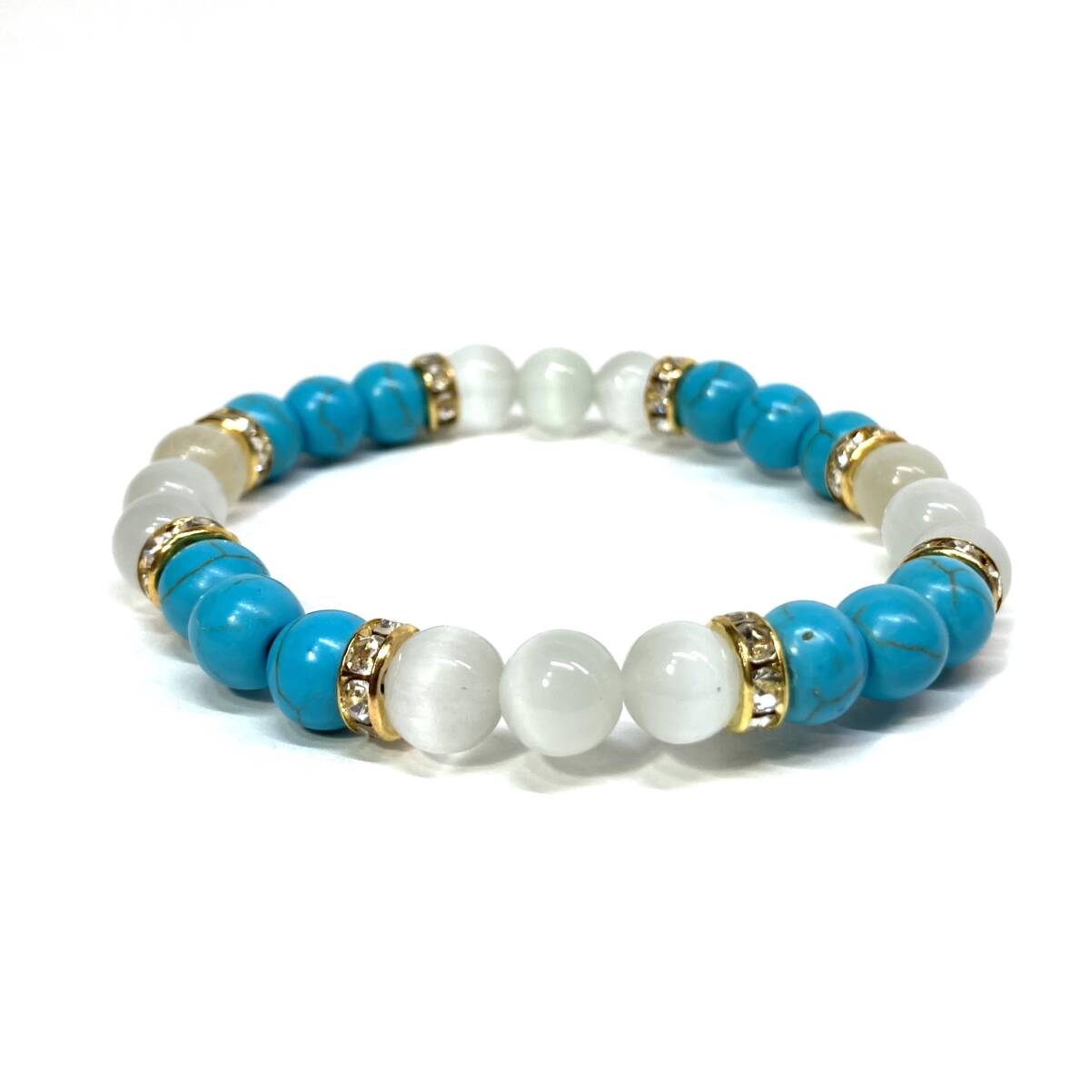 こちらは、8mm玉のホワイトキャッツアイとターコイズを使用したパワーストーンブレスレットです。間にはロンデルを挟み高級感ある大人っぽいデザインに仕上がっています。内周約16cmです。気になる方は是非この機会にどうぞ。