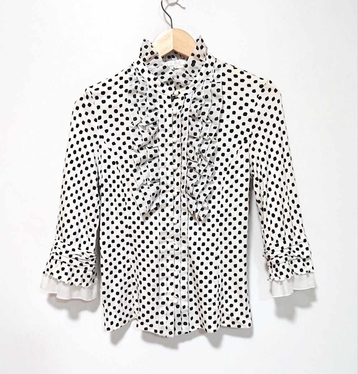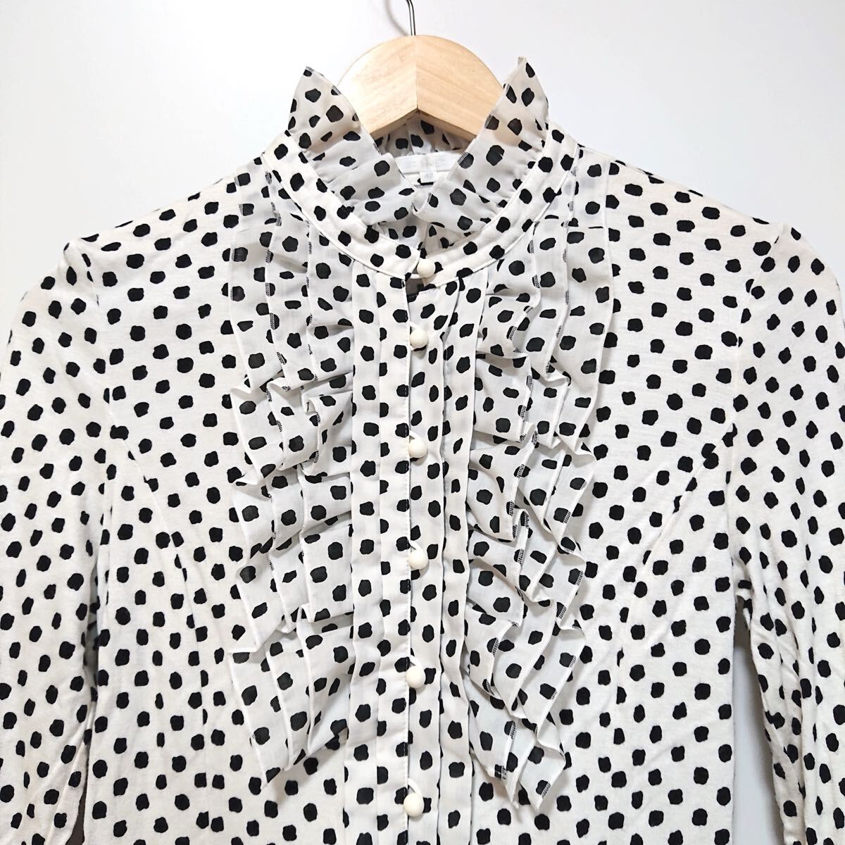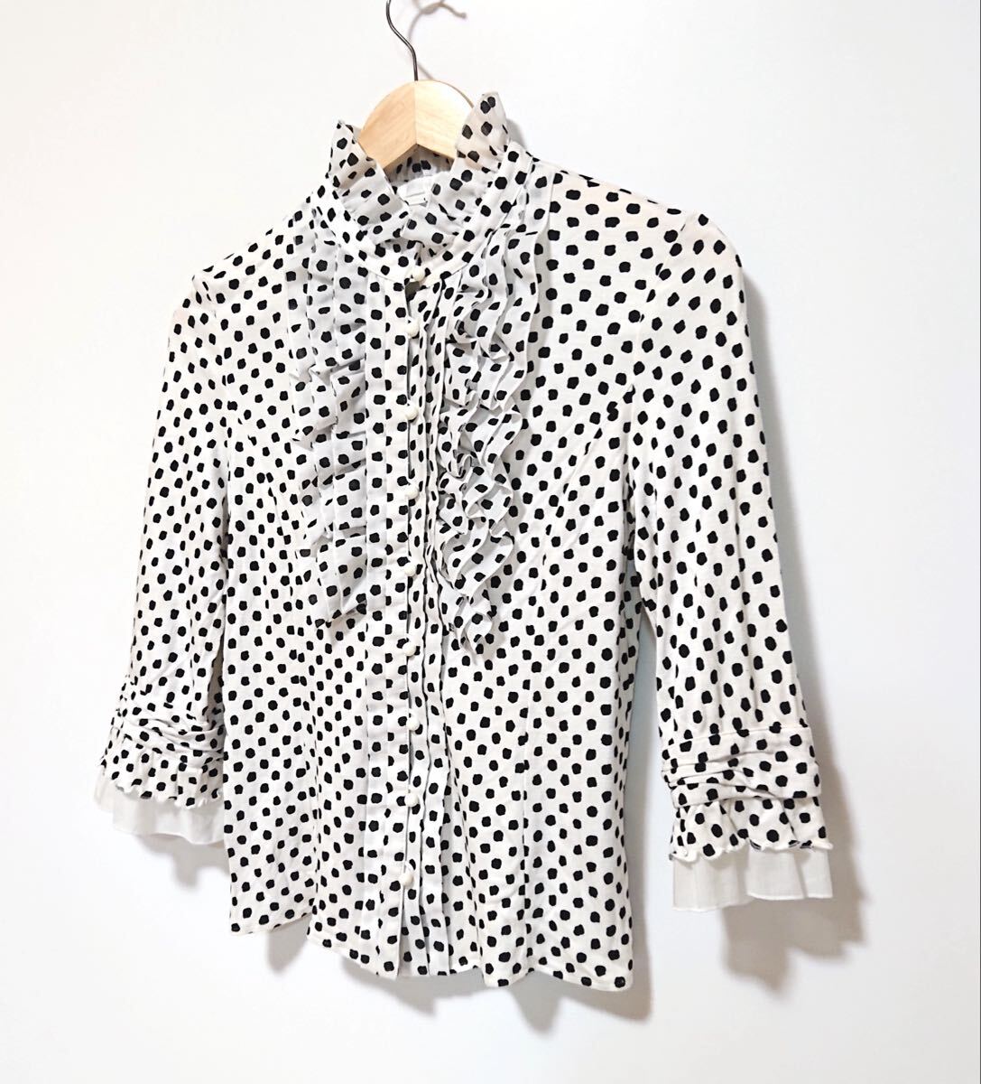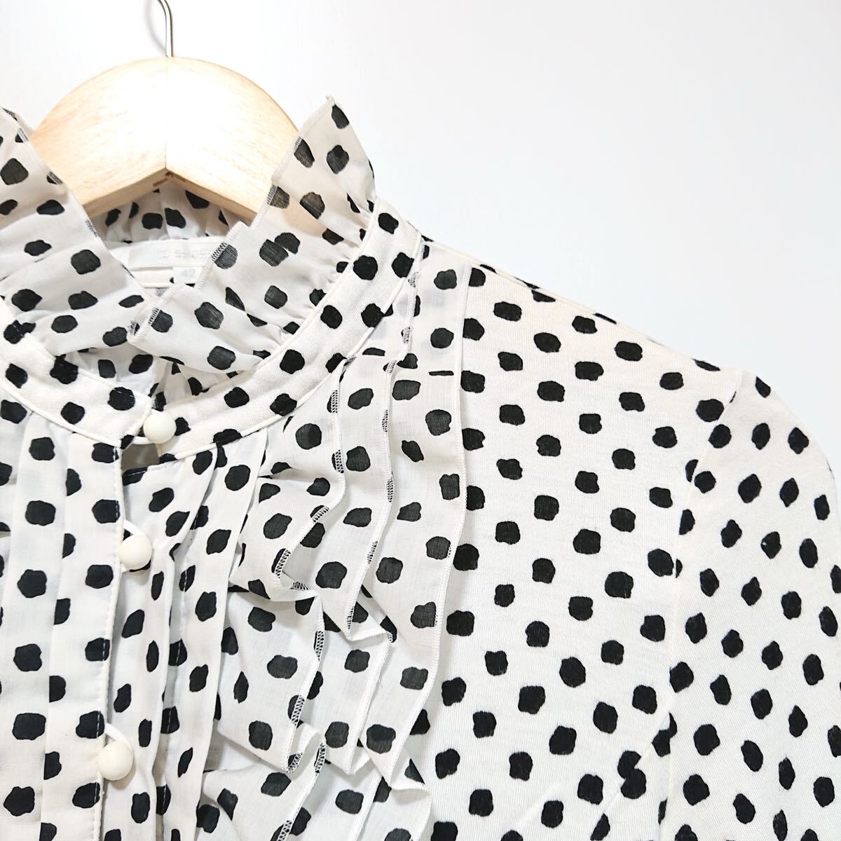 h4820gg TO BE CHIC/トゥービーシック サイズ42(M位) 七分袖カーディガン ドット柄 ホワイト×ブラック レディース フリル お洒落 三陽商会