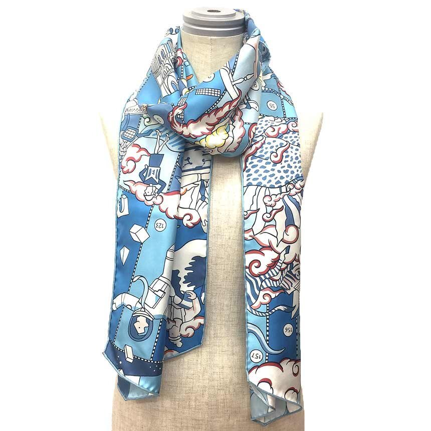 | PRコメント | 人気のツイリースカーフが大判サイズとなって登場。 人気デザインの“L'Epopee d'Hermes Detail エルメスの叙事詩”はエルメスの歴史を人生ゲーム風に表現していて、エルメスのユニークさを感じます☆ ロングタイプなので様々な結び方をお楽しみいただけます。 仕様:MADE IN FRANCE |