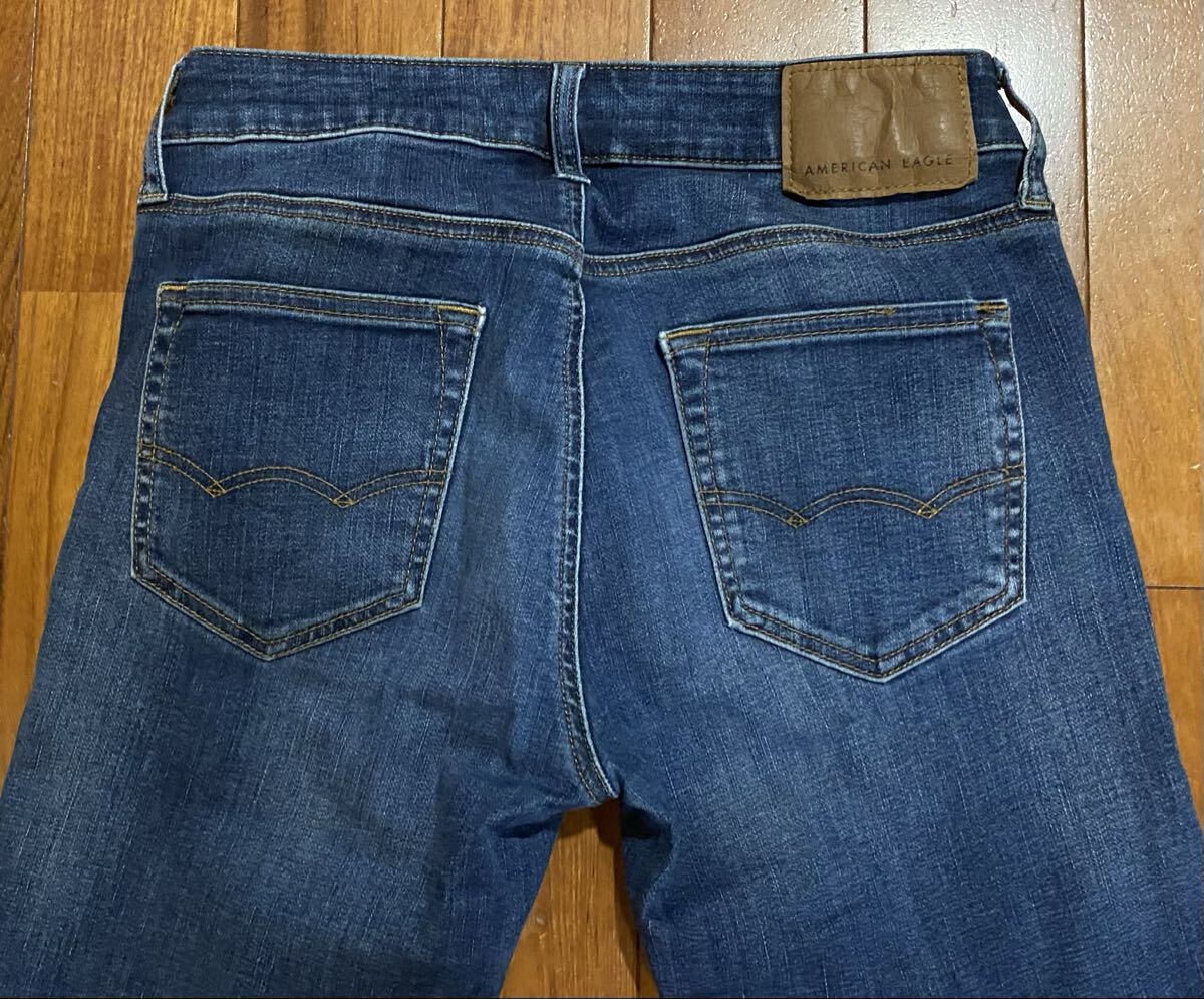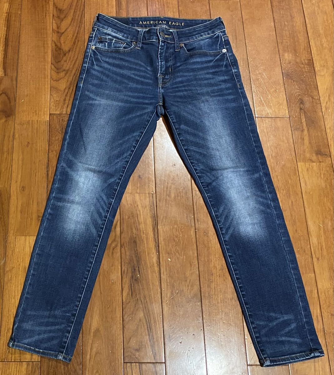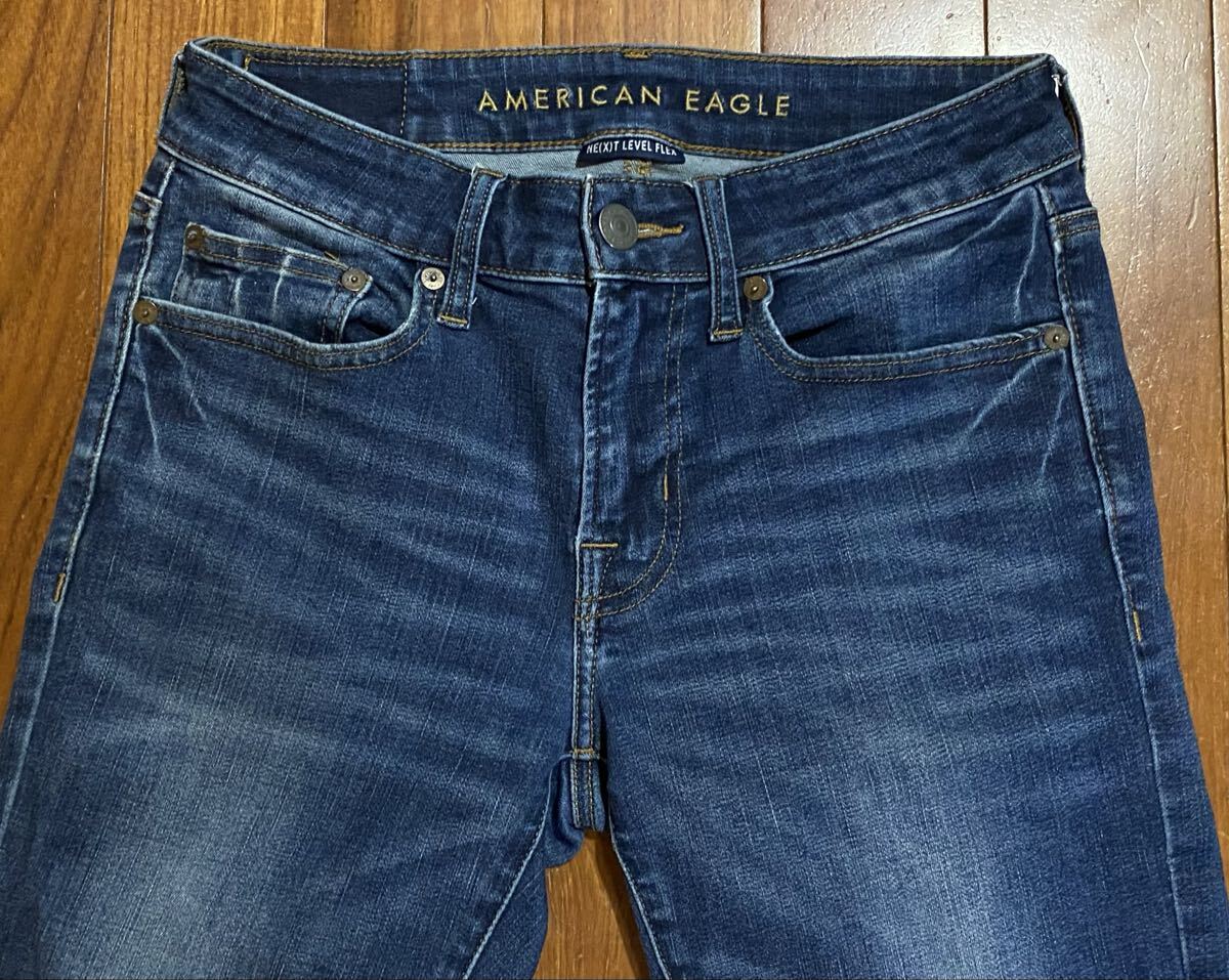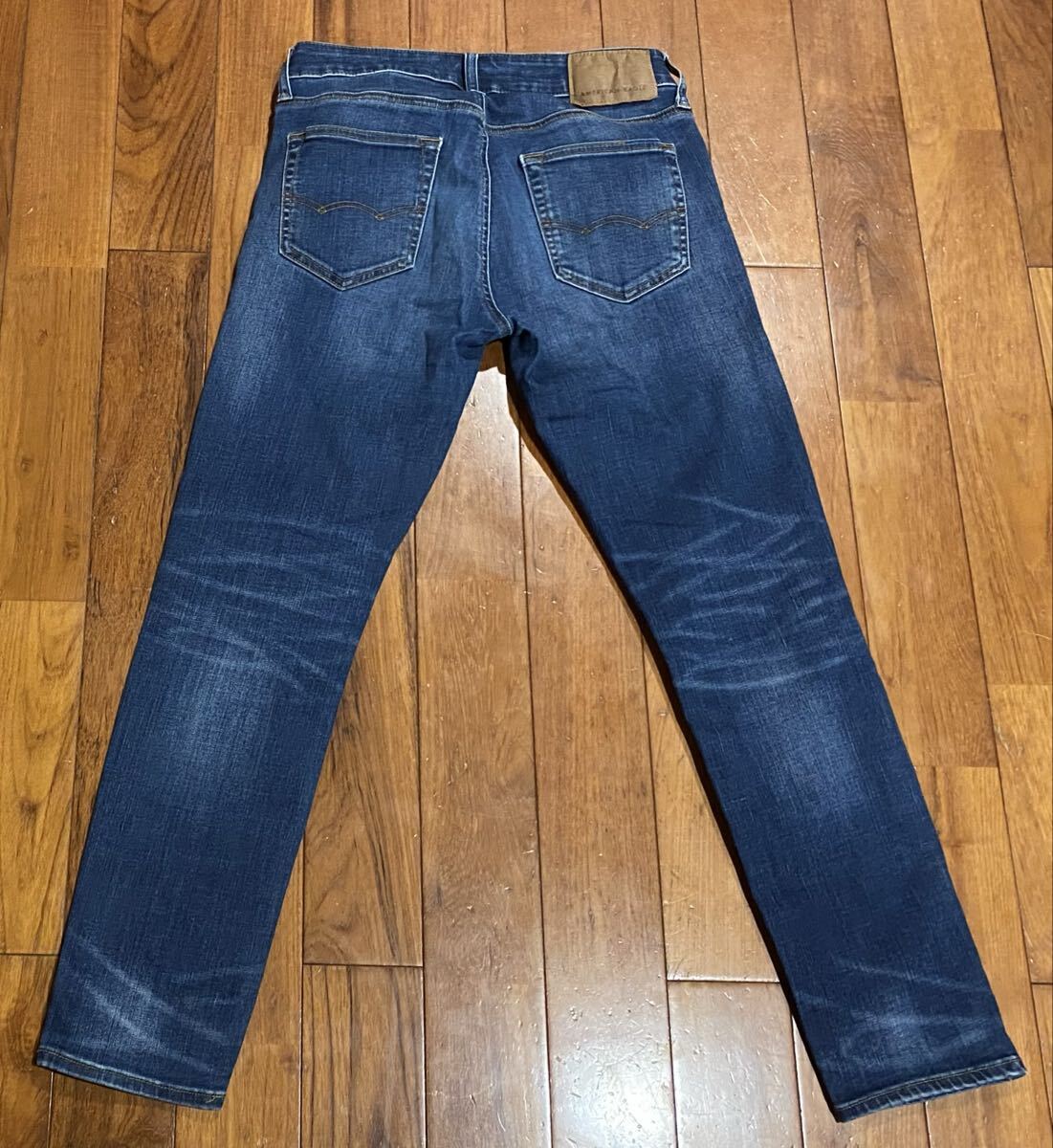 アメリカンイーグルのストレッチスキニーデニム(ジーンズ)、NE(X)T LEVEL FLEX SKINNYです。色はインディゴブルーです。USEDですが状態は良いです(10段階中8程度)。生地はストレッチ入りでコットン65%、ポリエステル23%、レーヨン10%、ポリウレタン2%です。紙パッチ、ジッパーフライ、裾はチェーンステッチです。正規品です((株)イーグルリテイリング、中国製)。サイズはW28×L28でウエストは重ねずに平置きで約74cm、ヒップ約92cm、股上約23cm、股下約69cm、股下15cmのふともも部分約46cm、裾まわり約29cm、重量約480gです。発送はゆうパケットポストになります。