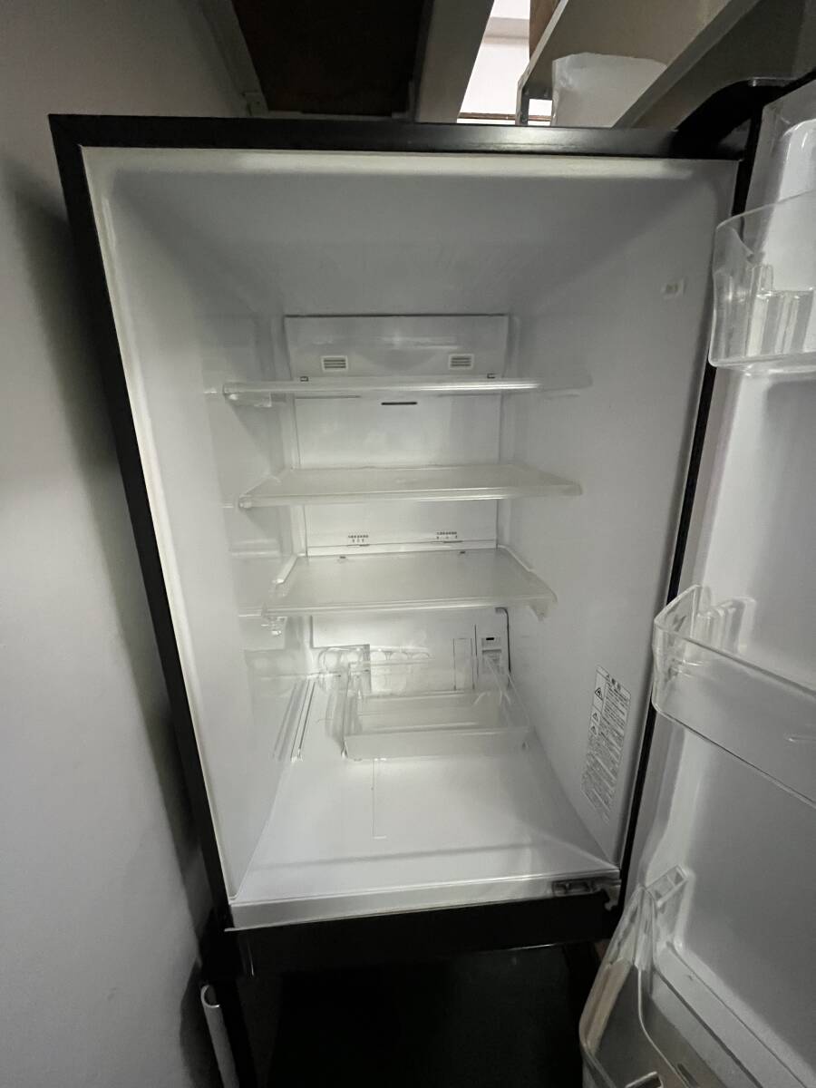 シンプルでスタイリッシュな黒い冷蔵庫、内部は3段の棚で効率的な収納が可能。