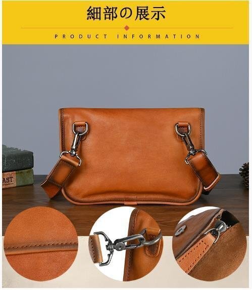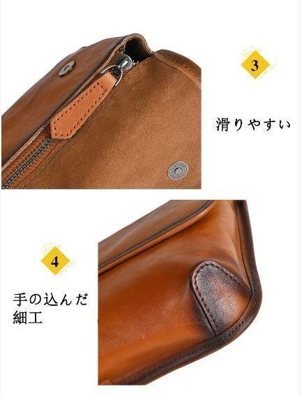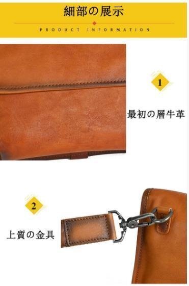 | ◆素材(外側):牛革 ◆カラー: ブラウン、ブラック、コーヒー ◆サイズ:横24cm×縦17cm×マチ5cm ショルダーベルト(調節可能) ◆収納可能サイズ: 財布、メガネ、化粧品など、携帯電話、時計"" |