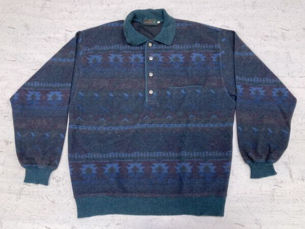 ITALY製 Cazzaniga Legnano オールド レトロ トラッド 古着 ネイティブボーダー ウール混 長袖ニットポロシャツ メンズ L 緑/青 です。