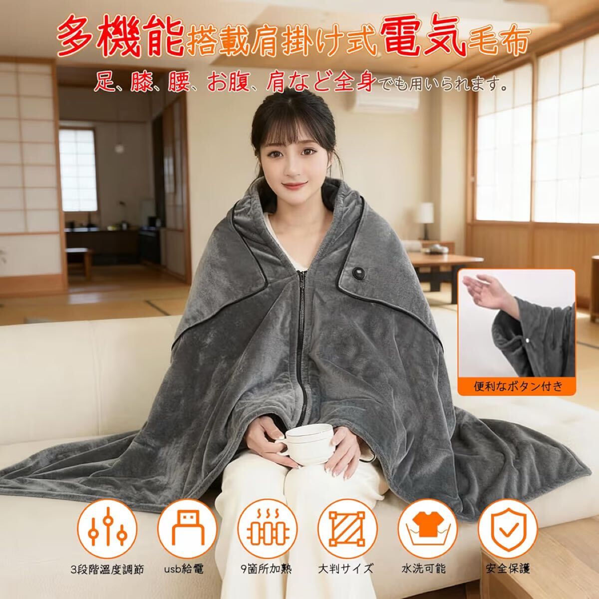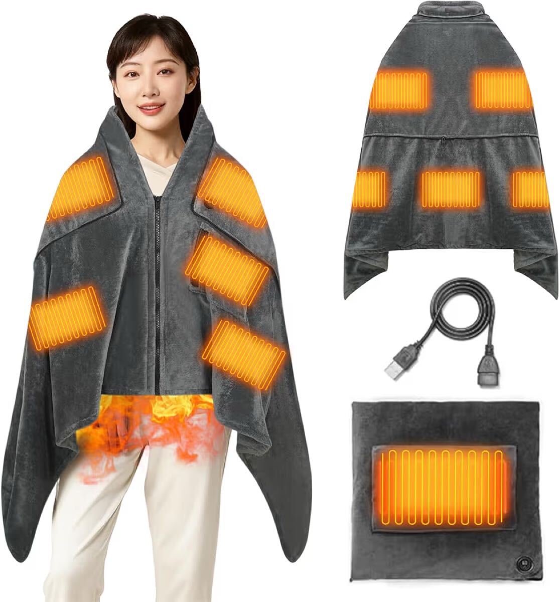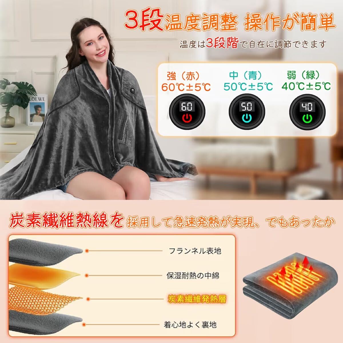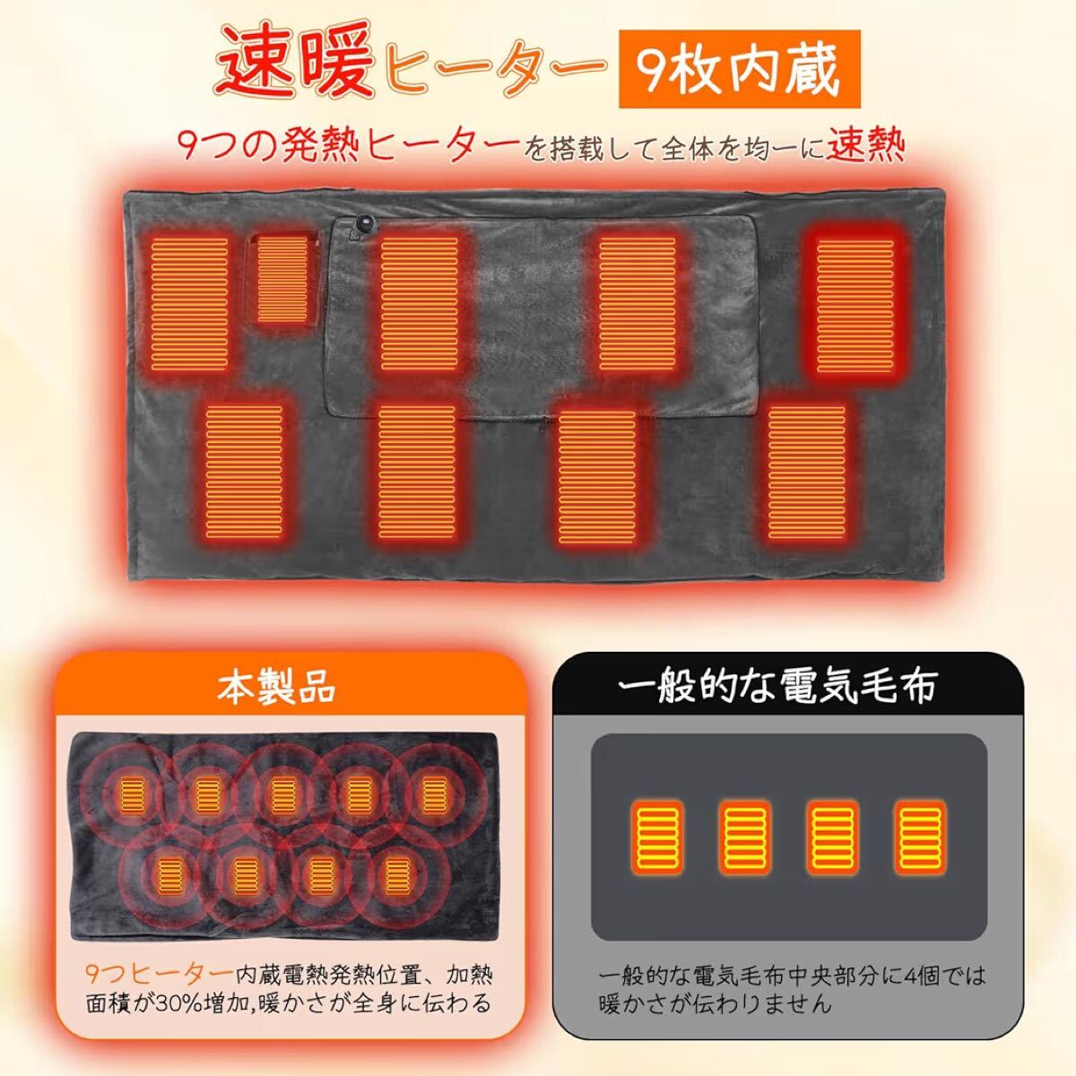 【9つヒーター内蔵& 寒さ対策】電気ブランケットは9枚のヒーターを内蔵しています。電源と接続後、10秒程度で温かさを感じることができます。安全性を考慮し、最大加熱温度を約60℃に設定しています。ベッドだけでなく、ソファでテレビを見たり、オフィスの椅子に座ったりしても使えます。 電気毛布は折りたたんでスペースを取らず、持ち運びが簡単で、車の中での使用や野外キャンプに適しています。[ご注意:お客様の使用環境、室内・室外湿度と温度によって、人体で感じられる温度は5℃の差がありますので。]