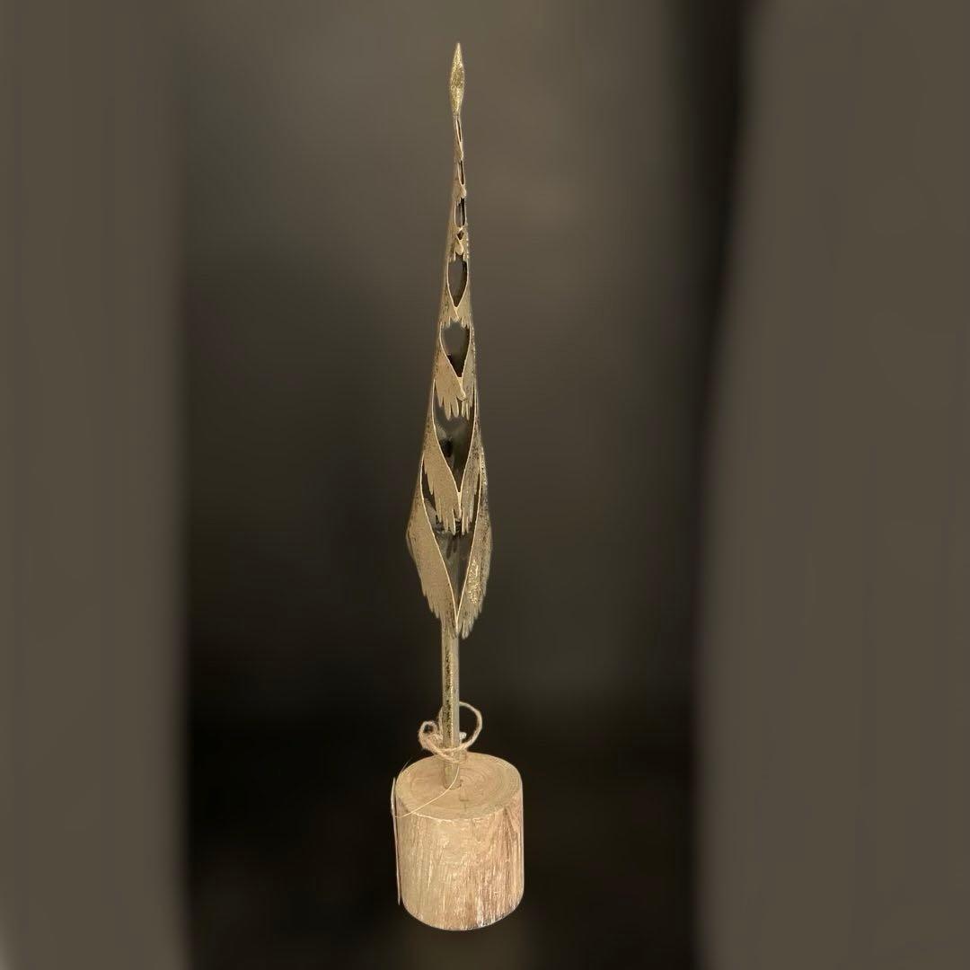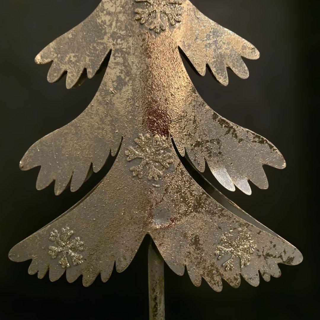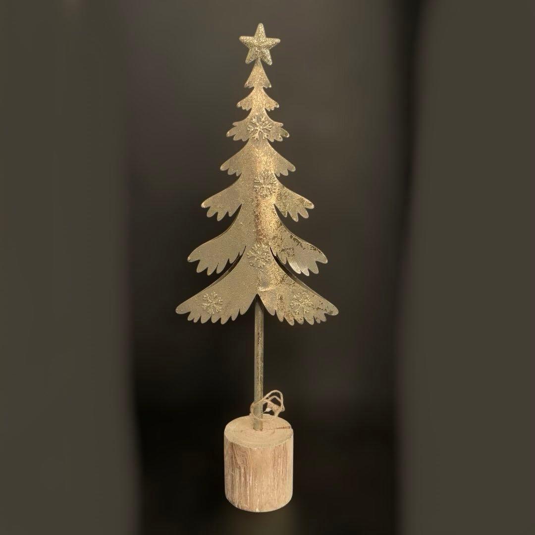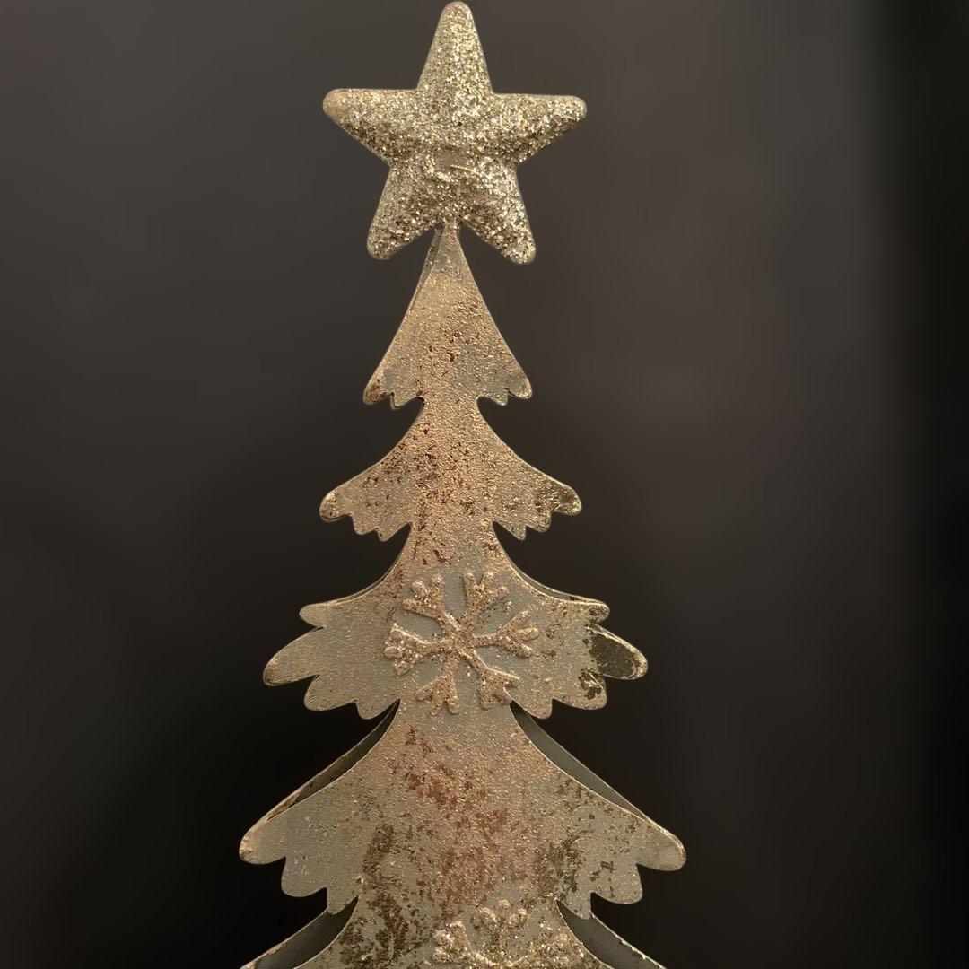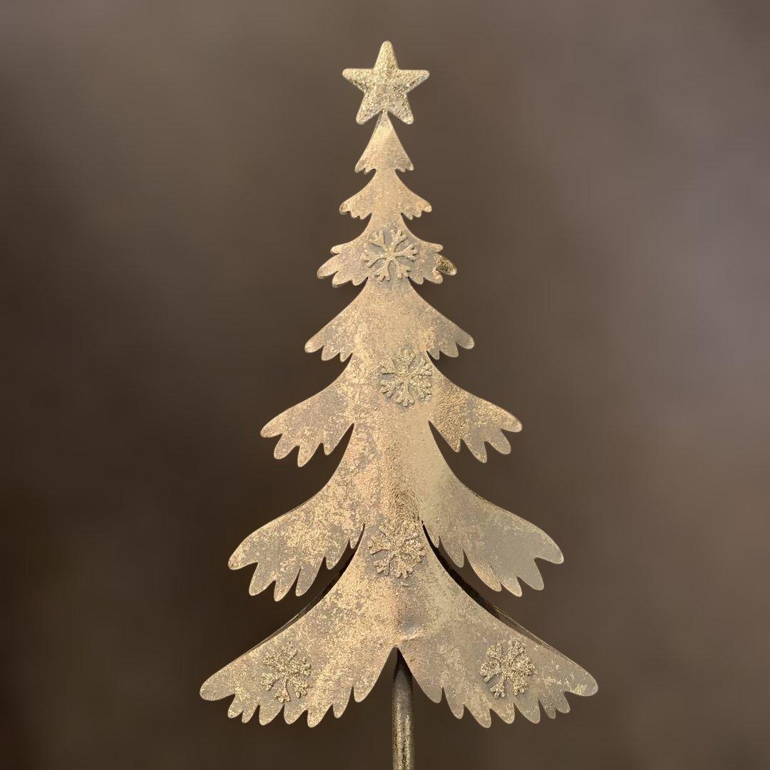 シャンパンゴールドの金属製クリスマスツリーです。キラキラ星型のトップと雪の結晶模様が綺麗なツリーです!