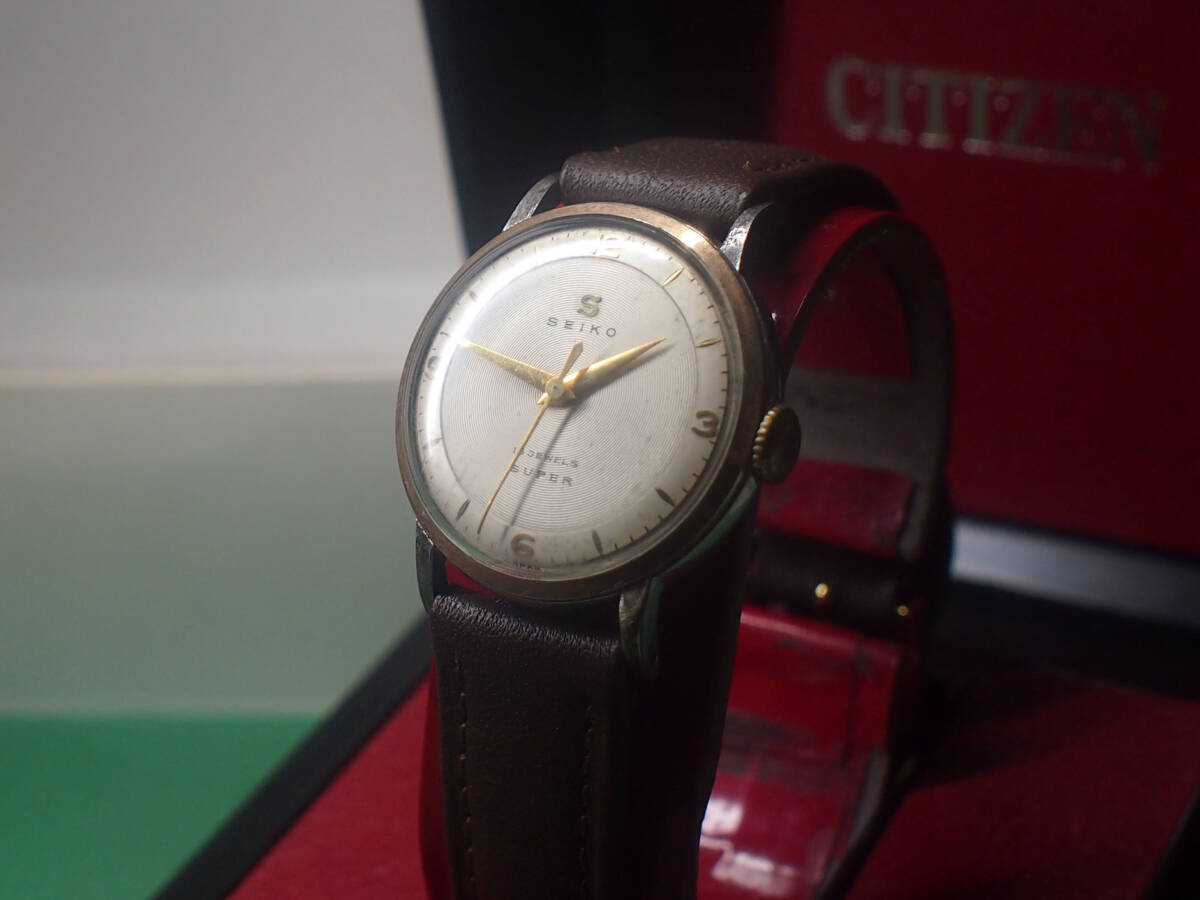 70年前の時計 SEIKO セイコー SUPER スーパー 15  手巻き 14金張り 変わり文字板 稼働品  アップライト蛇Sロゴ 新品茶革ベルト
