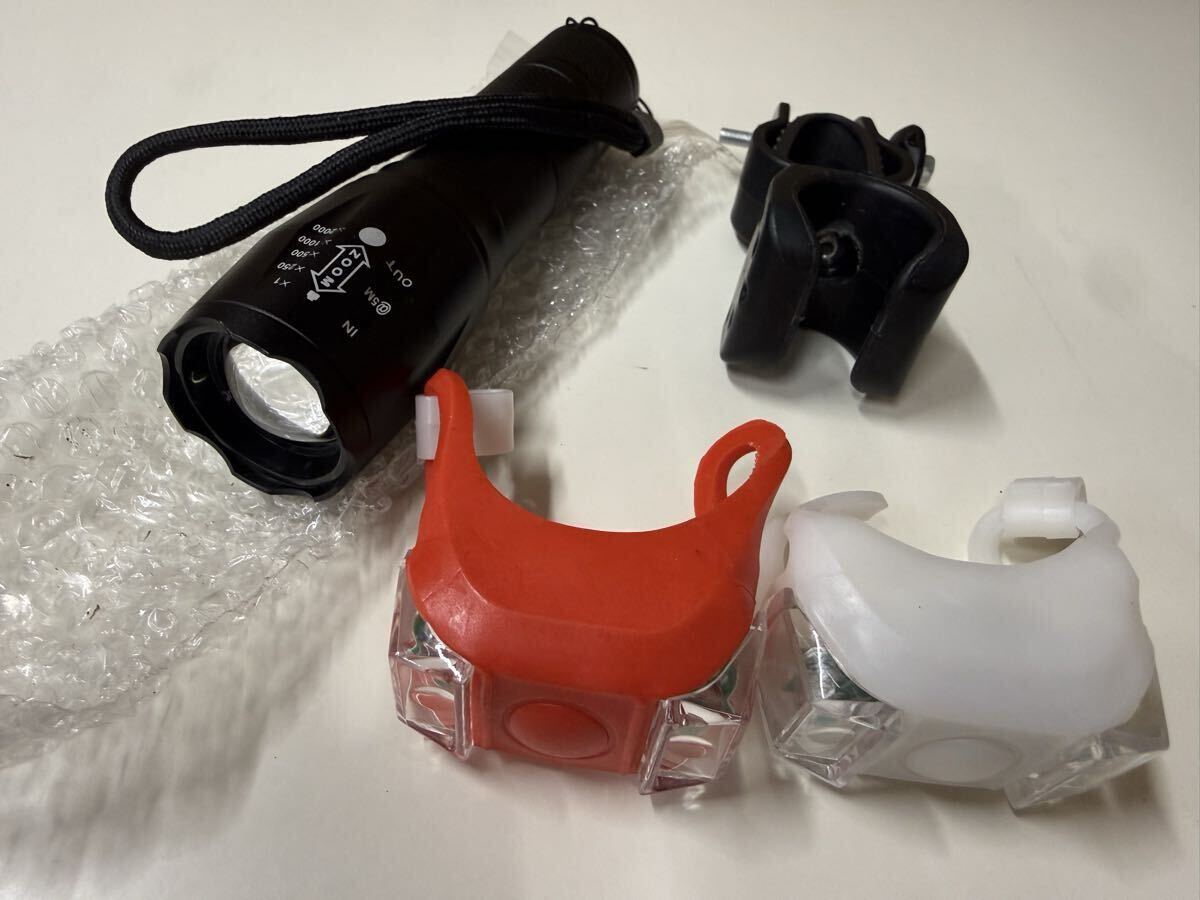 こちら輸入販売をされていた方からの譲受品です。 自転車のフロントライトとして利用できる他、懐中電灯や防災用としても利用できます。 この機会に複数お持ちになるのはいかがでしょうか? 自転車への取り付け金具、リヤ用の点滅ランプ、赤と白のセットになります。 ゆうパック60サイズにて発送予定です。