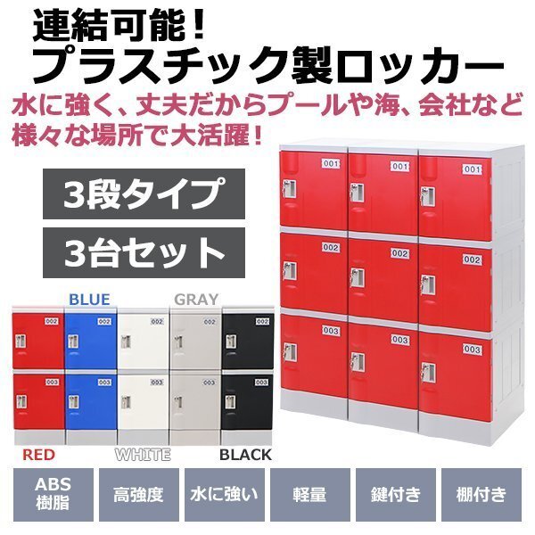 | 商品名 | 送料無料 プラスチックロッカー ロッカー エコノミーモデル 連結可能 3人用 3段 3台セット おしゃれ 選べる5カラー 水に強い 鍵付き スペアキー付き ABS樹脂製 樹脂ロッカー プラスチック製 収納 プール 海 事務所 会社 病院 更衣室 貴重品 オフィスロッカー オフィス家具 サイドチェスト plalocker33 |
