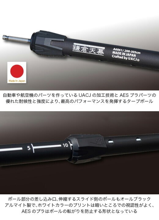 ポールは自動車や航空機のパーツを作っているアルミニウム総合メーカーのUACJ製で、優れた加工技術とAESプラパーツの耐候性と強度により、アウトドアにおいて最高のパフォーマンスを発揮します。