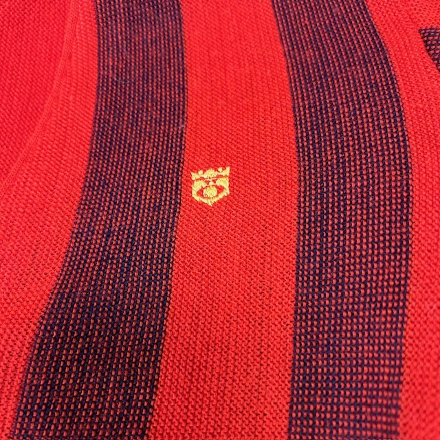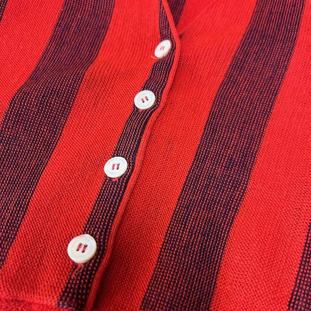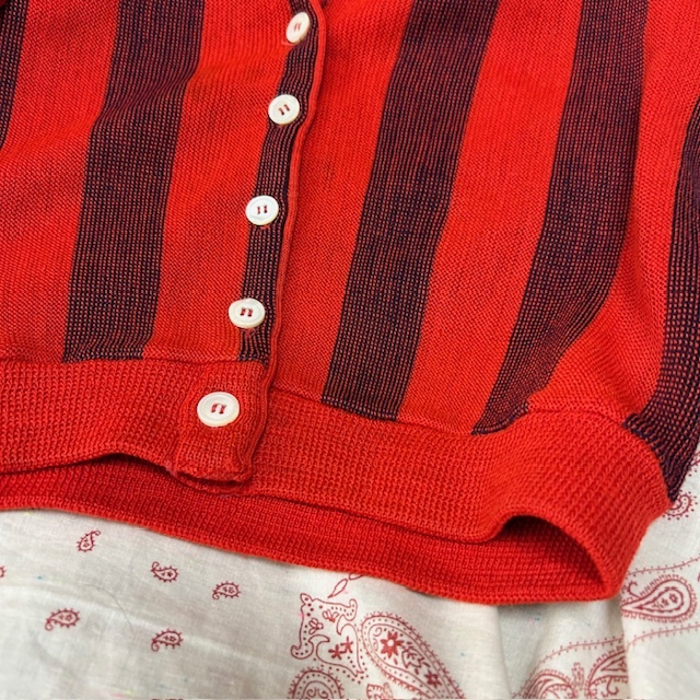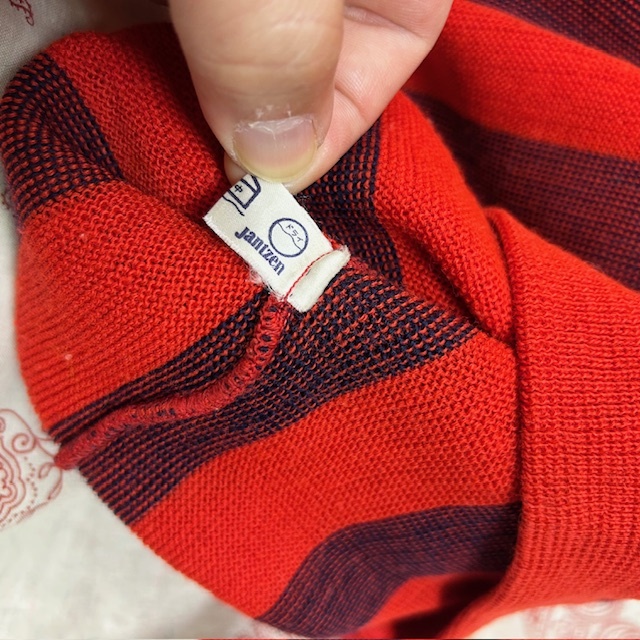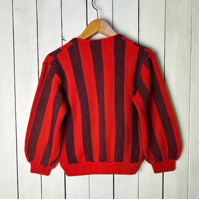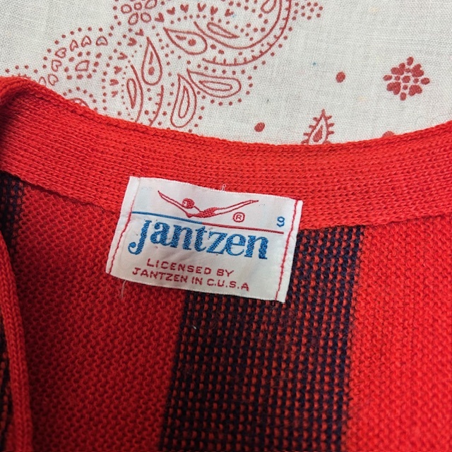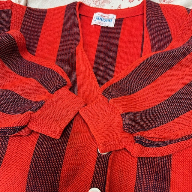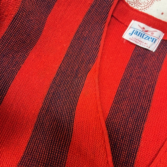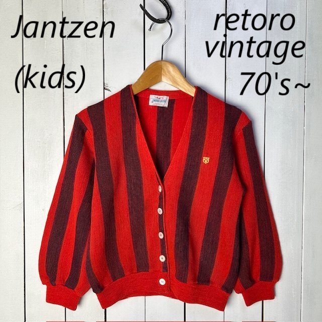 ●商品説明・・・70年代~80年代頃のオールド・ヴィンテージ jantzenの太ストライプのニットカーディガンです。アームホールは太めのゆったりした作りになっています。素材表記は無いのですが、おそらくアクリル系かと思います。色は赤に濃紺のストライプのような感じです。サイズはUSAの9表記で、110・120・小さめ130の間ぐらいかと思いますが、実寸を参考によろしくお願いします。