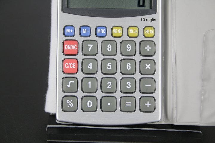 ・見やすい大画面表示。10桁。2電源。早打ち対応。税計算。