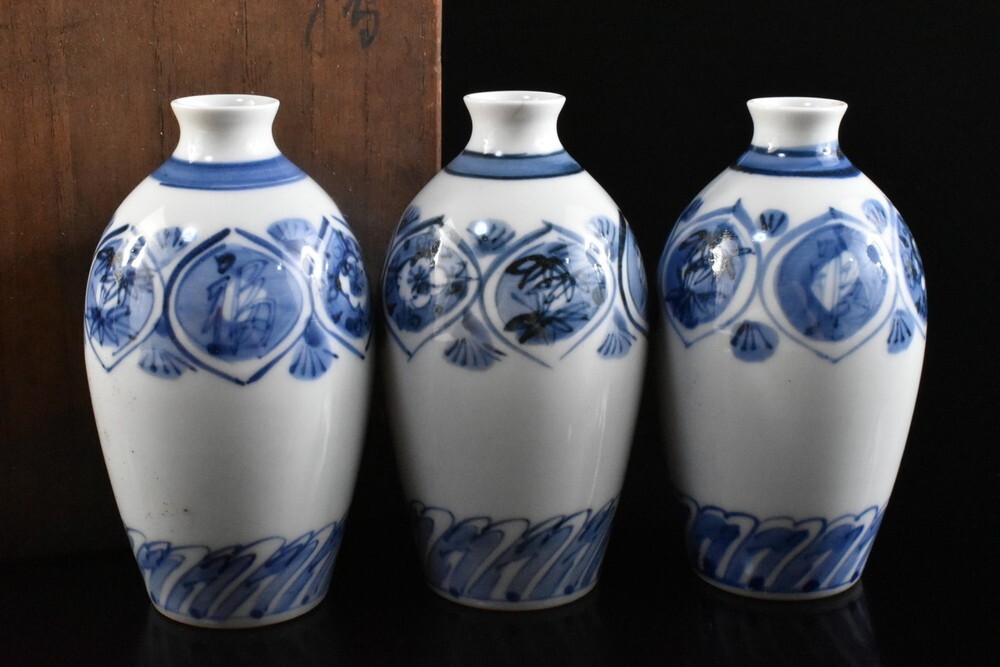| 商品名 | 【雲】某収集家買取品 平戸焼 染付花笹絵付徳利 3客 在銘 共箱 古美術品(酒器) K1019 |