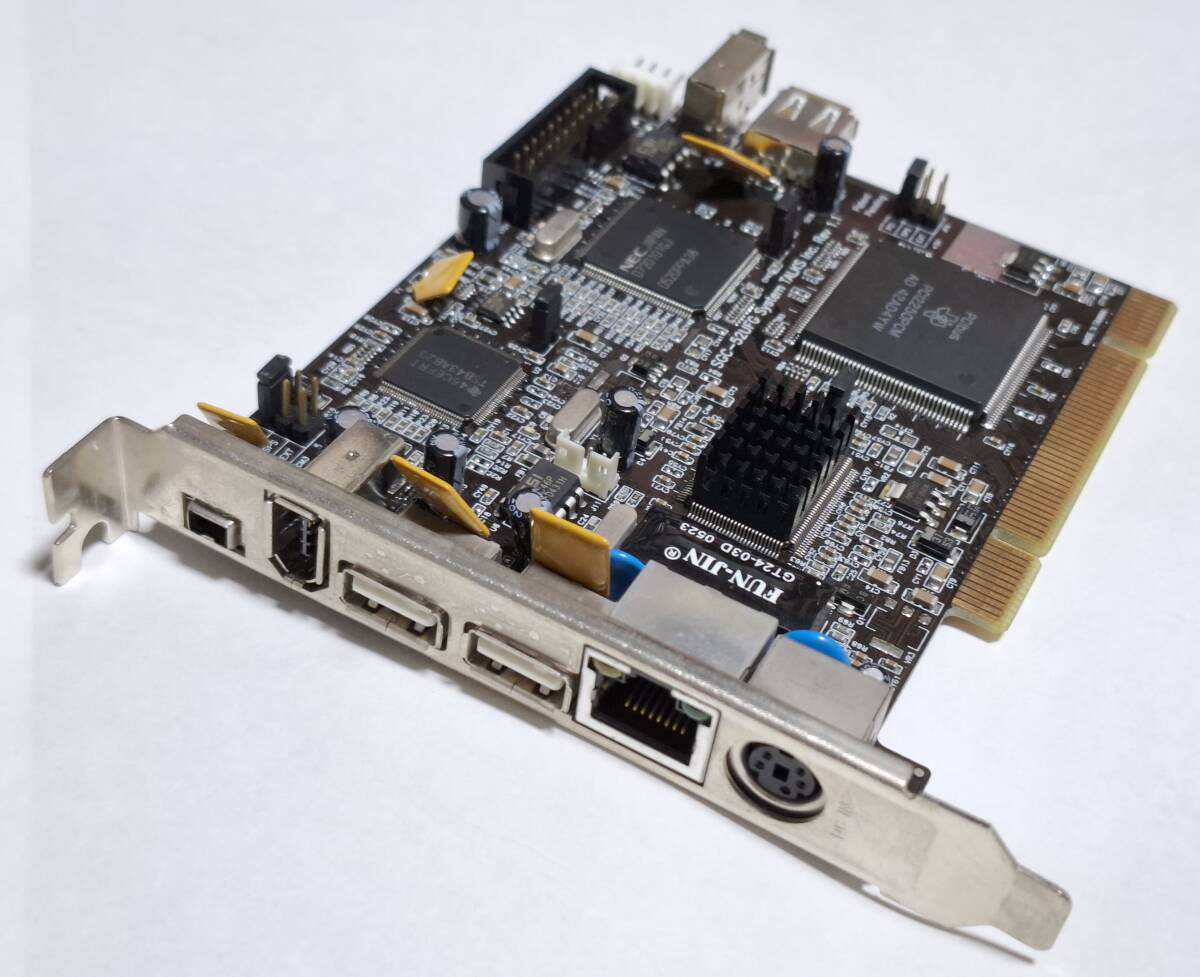 | 2000年代初頭のPCIバス用複合ボード。USB2.0・IEEE1394・LAN(1000BASE-T)を1枚のボードで実現。Win98SE/Me/2K/XP・MacOSX10.28以降対応。 |