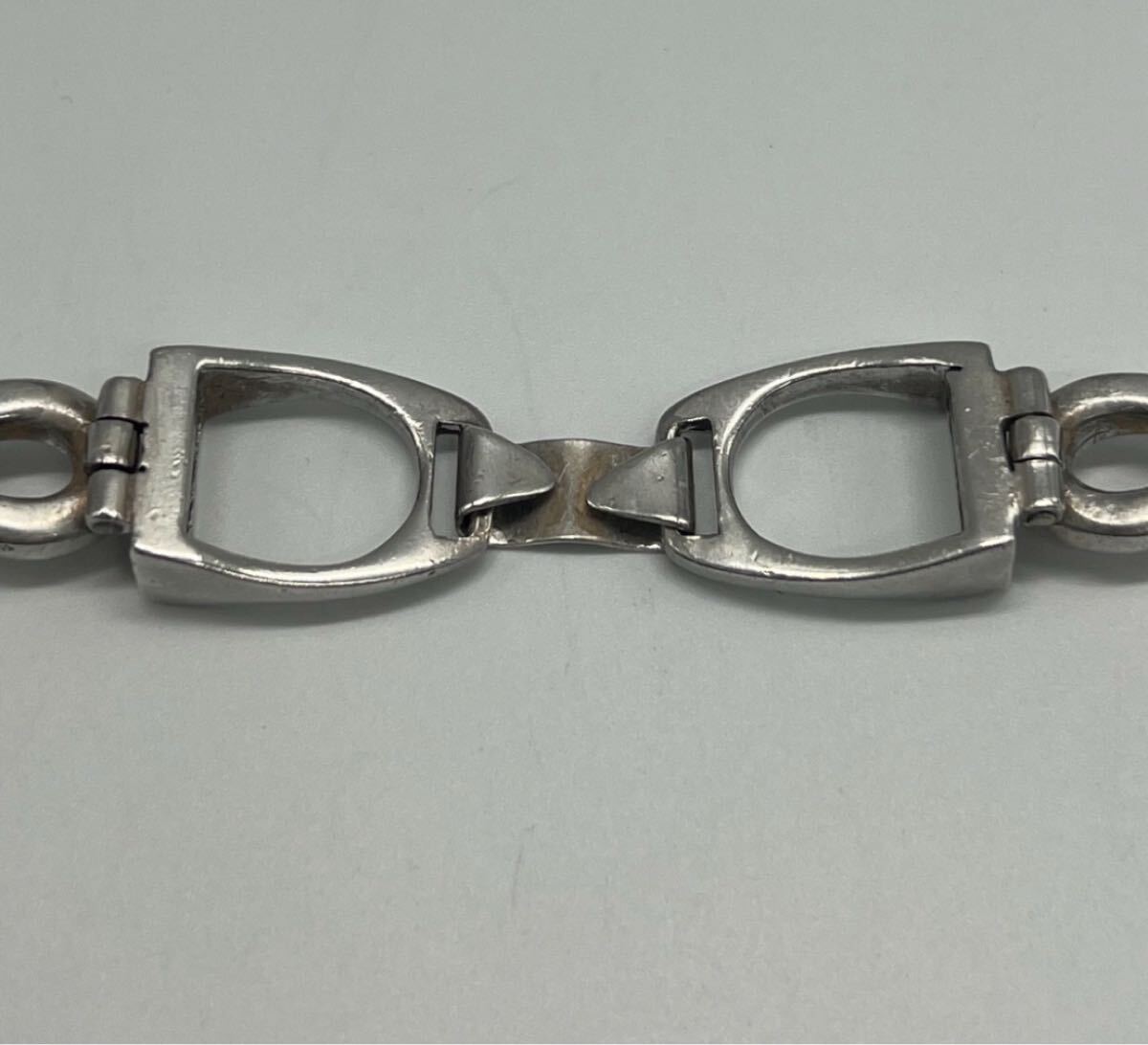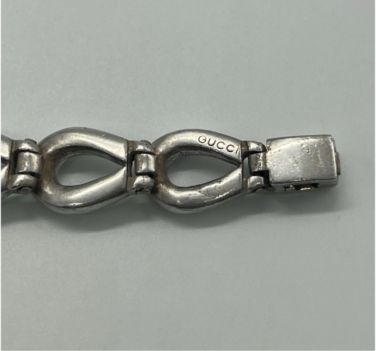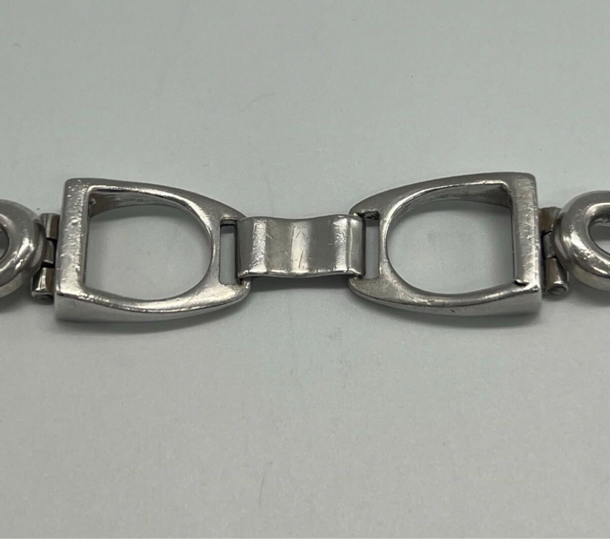 トップにはホースビットを彷彿とさせるデザインにチェーンには幅のある輪っかのリンクが使用されており、オールドグッチの雰囲気が漂う存在感のあるお品物でございます。