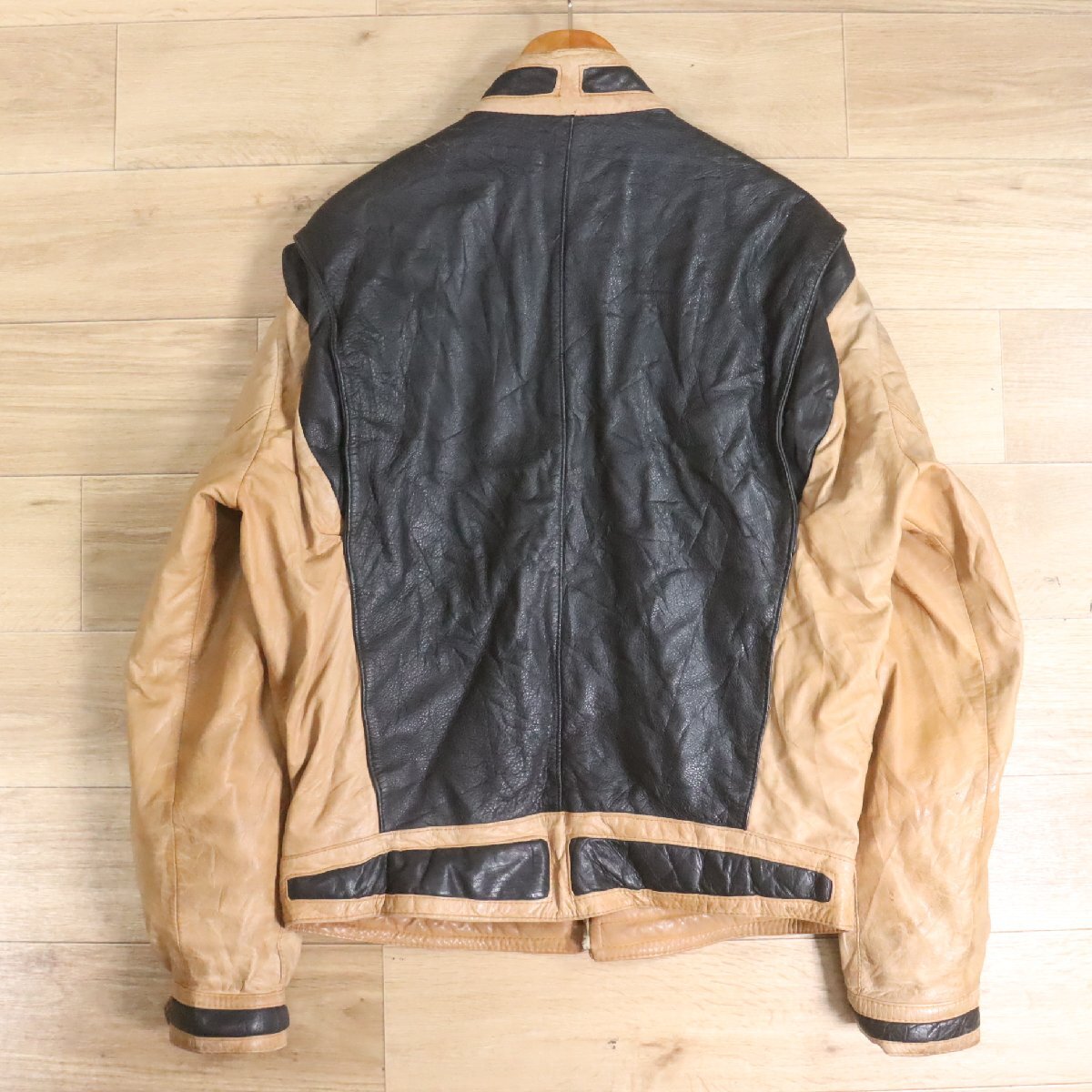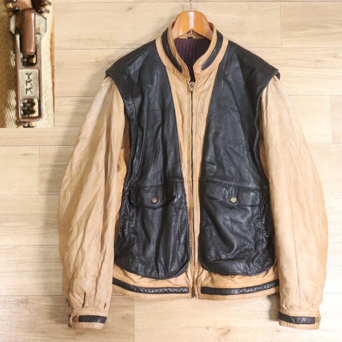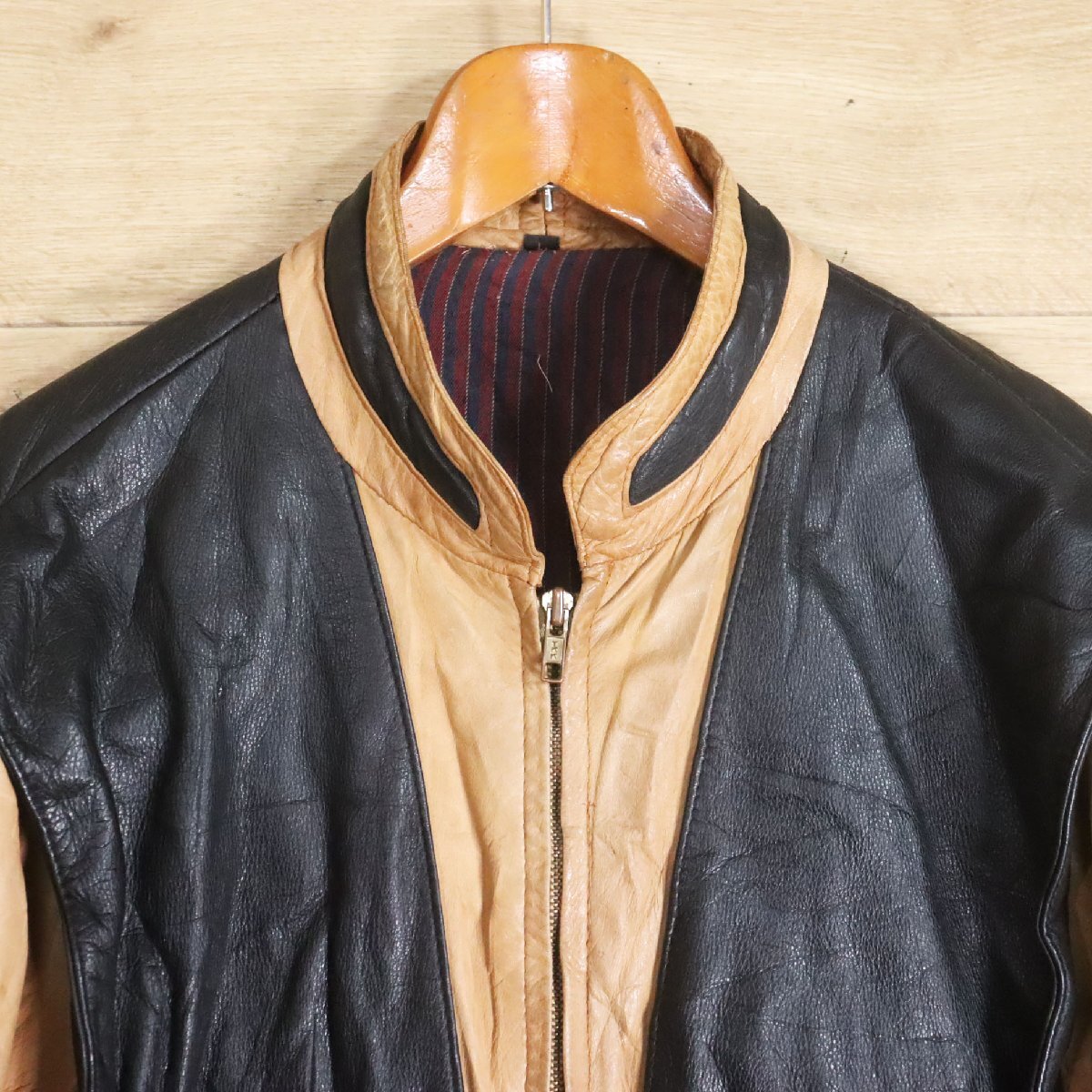 F8S/Y6.16-1 ユーロ古着 レザージャケット 本革 スタンドカラー レザーブルゾン ライダース レイヤードスタイル L ヴィンテージ