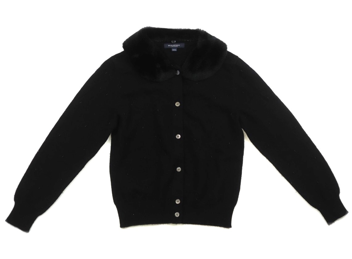 アクリルニット素材。付け襟のフェイクファーは取り外し可能。袖に白っぽい汚れあり。毛玉がありますが、普段使いにいかがでしょうか。