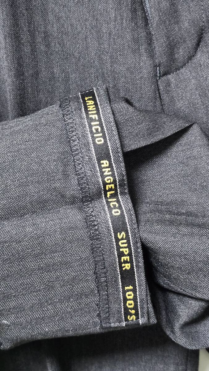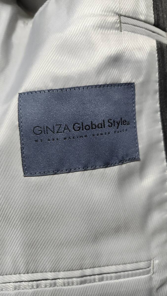 GINZA Global Styleレーベルのグレースーツです。表地は伊ANGELICO(アンジェリコ)Super100s・ウール100%。遠目にはシャドーストライプのように映る細ヘリンボーンで、ビジネスに最適な清潔感と艶を備えます。サイズは小さめ(160cm前後の方に好相性)着用少の整った個体です。