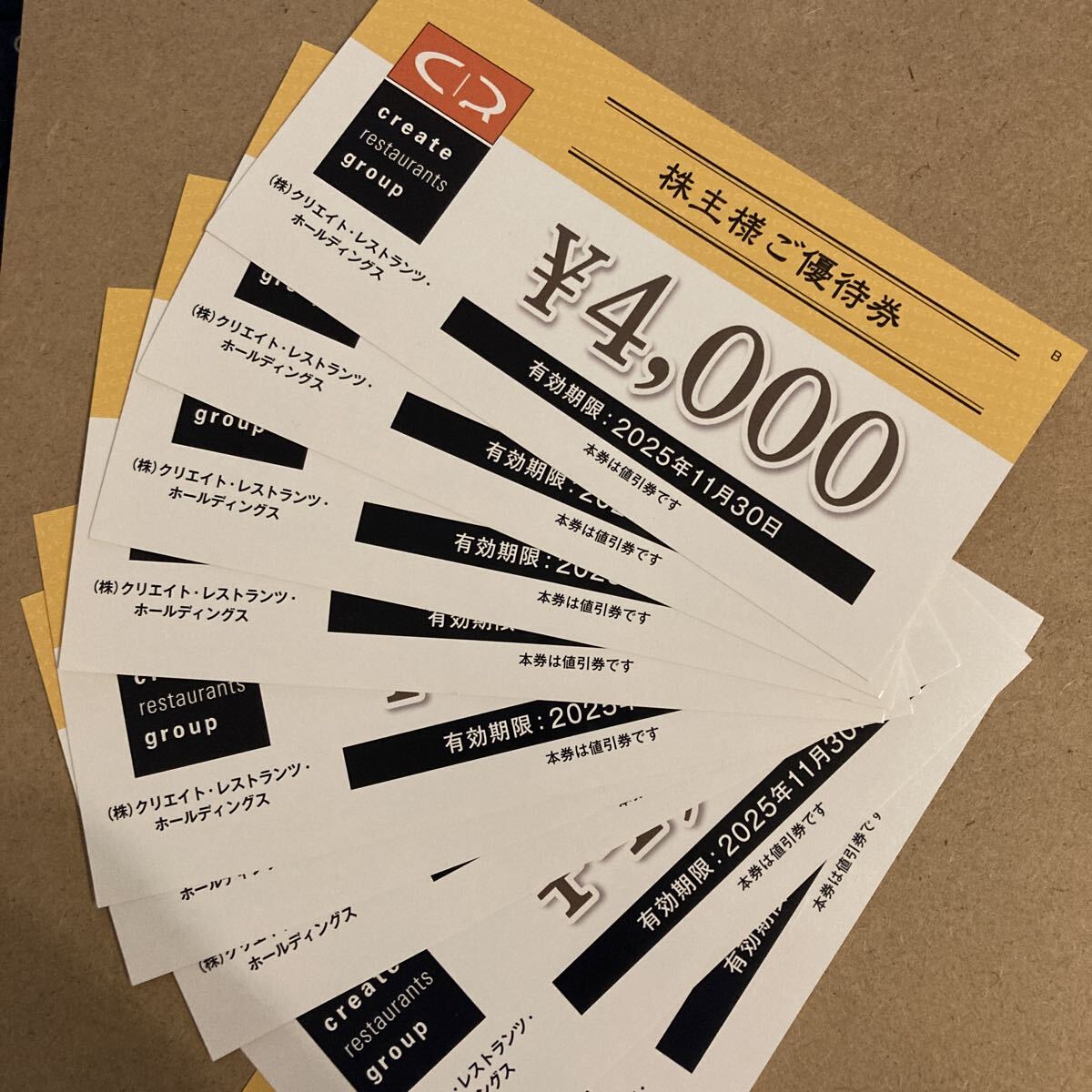 クリエイトレストランツホールディングス 株主優待券4000円券 期限2025年11末 在庫9枚36000円分まで可