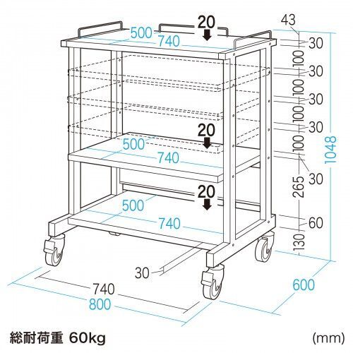 ※配送の送り主はサンワサプライ(株)と記載されています。沖縄・離島配送不可となります。 当店は正規販売代理店です。 特長 立ち作業に最適なハイスタンドラックです。 検査機器、操作機器、レーザープリンターなど一式を収納し、移動させて使用できます。 ※重心位置が高くなった際、段差などを乗り越える場合は転倒にご注意ください。 移動に便利な大型キャスター(直径100mm)付きで、前方2個は車輪ロック付きです。 後ろ側のガードバーを外すことで、クランプ式のモニタアームの設置が可能となります。 棚板は2枚標準装備です。 棚位置は130mmピッチで高さを調節できます。 天板サイズはW740×D500mmです。 気をつけておりますが、タイミングによっては在庫切れの場合があります。 仕様