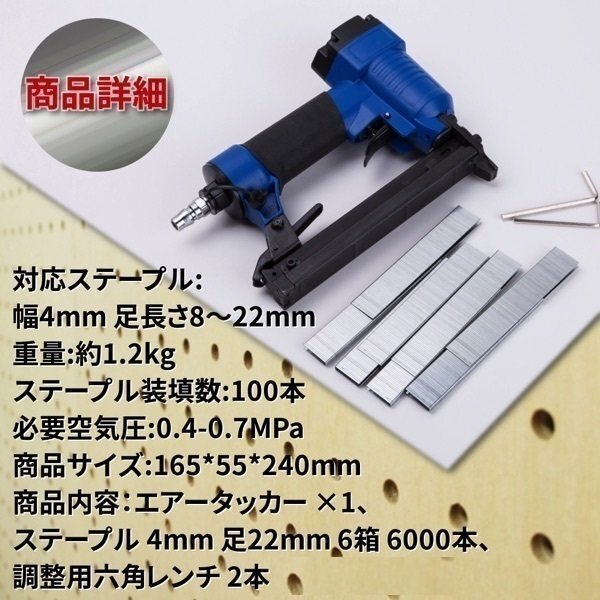 商品内容:エアータッカー ×1、ステープル 4mm 足22mm 6箱 6000本、調整用六角レンチ 2本