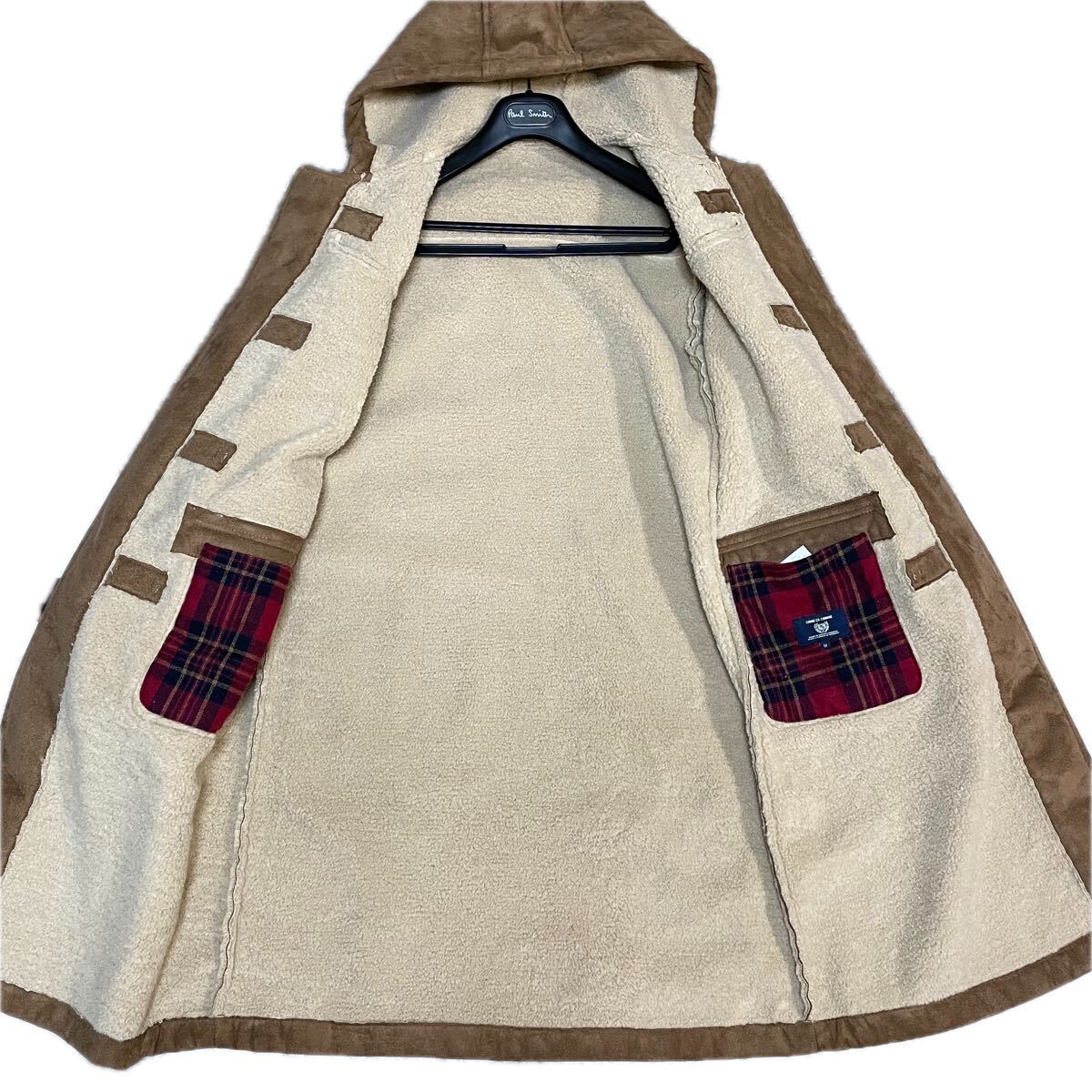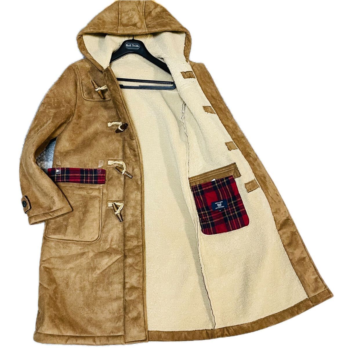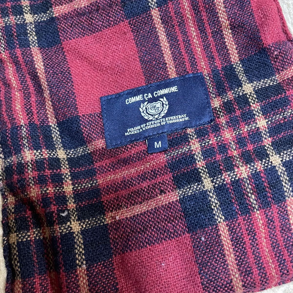 希少デザイン◆COMME CA コムサ ムートンコート ジャケット M ボア ファー 毛皮 極暖 肉厚 赤 チェック キャメル ブラウン ロング丈