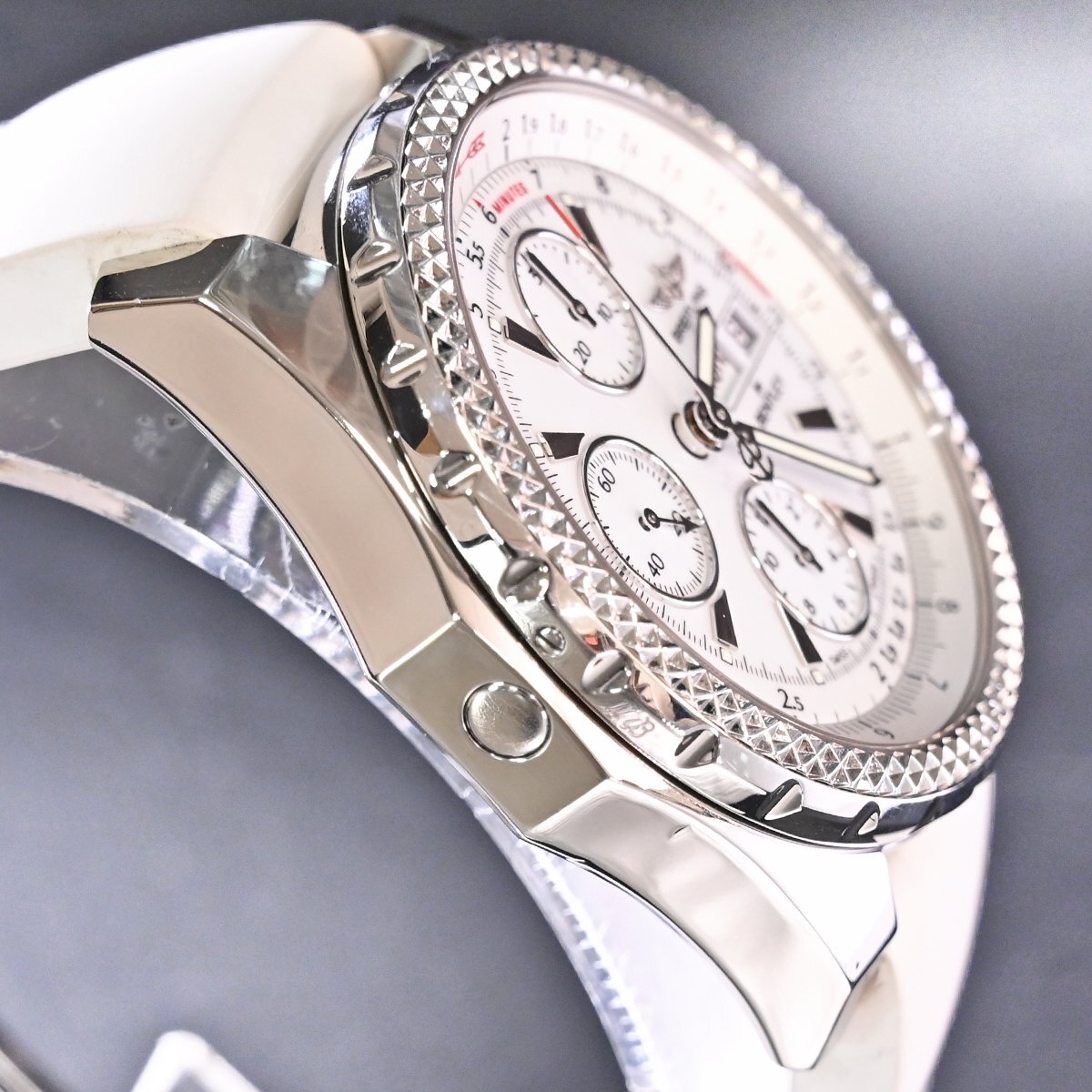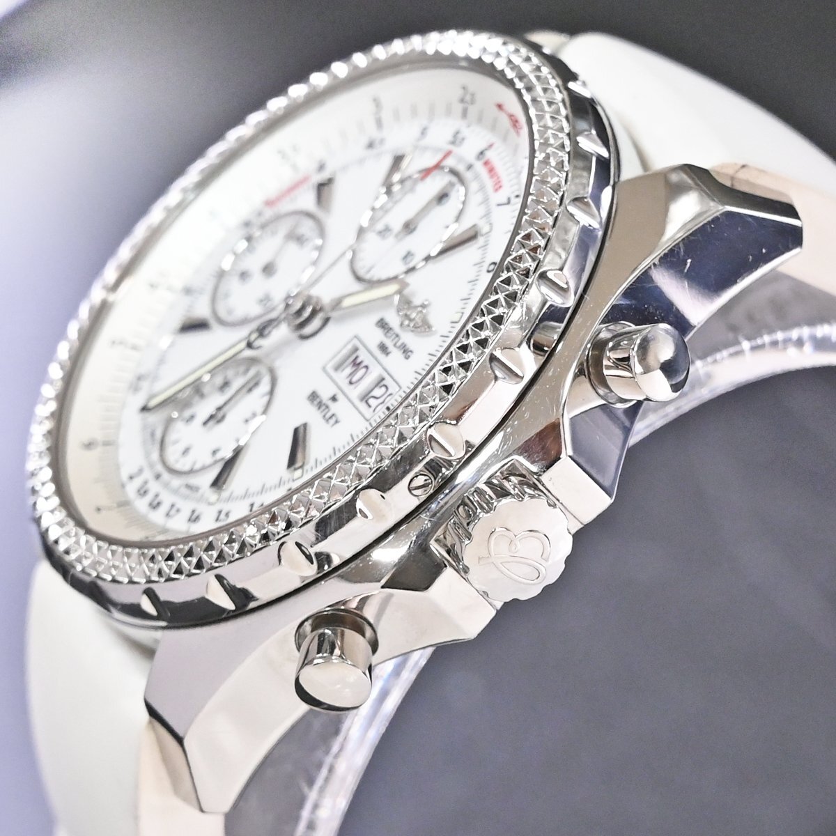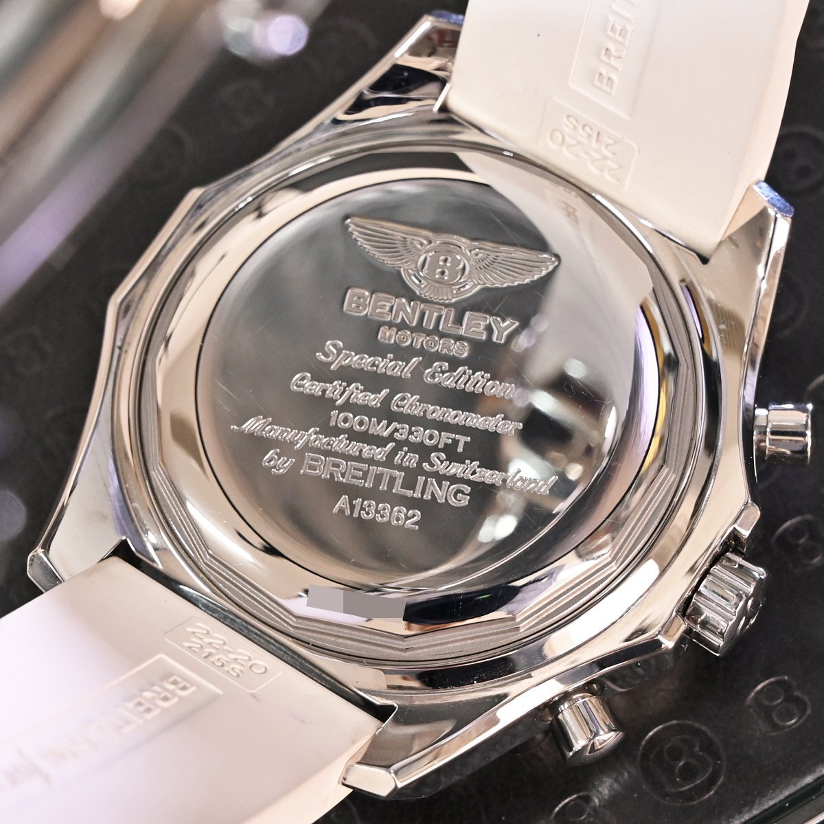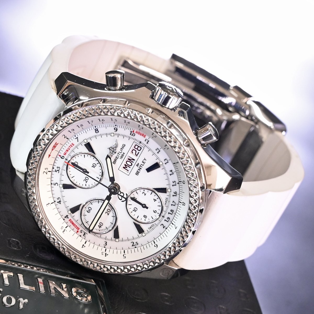 ブライトリングのA13362 ベントレーGT ホワイト ラバーです。 英国ラグジュアリーとスイス精密工学が融合した、BREITLING for BENTLEY GT。 搭載キャリバーは信頼のCal.13自動巻クロノグラフ。 ポリッシュ仕上げのケースと立体的なバーインデックス、そしてベントレーのメッシュグリルを想起させる文字盤ディテールが、他のクロノグラフとは一線を画します。 モータースピリットを感じさせる力強さと、ホワイトトーンの上品さが共存した一本。 街でもサーキットでも、**「走るためのエレガンス」**を体現するモデルです。 市場流通量の圧倒的に少ないモデルなのでお探しの方も非常に多いかと思います。 ※基本動作確認済。 |