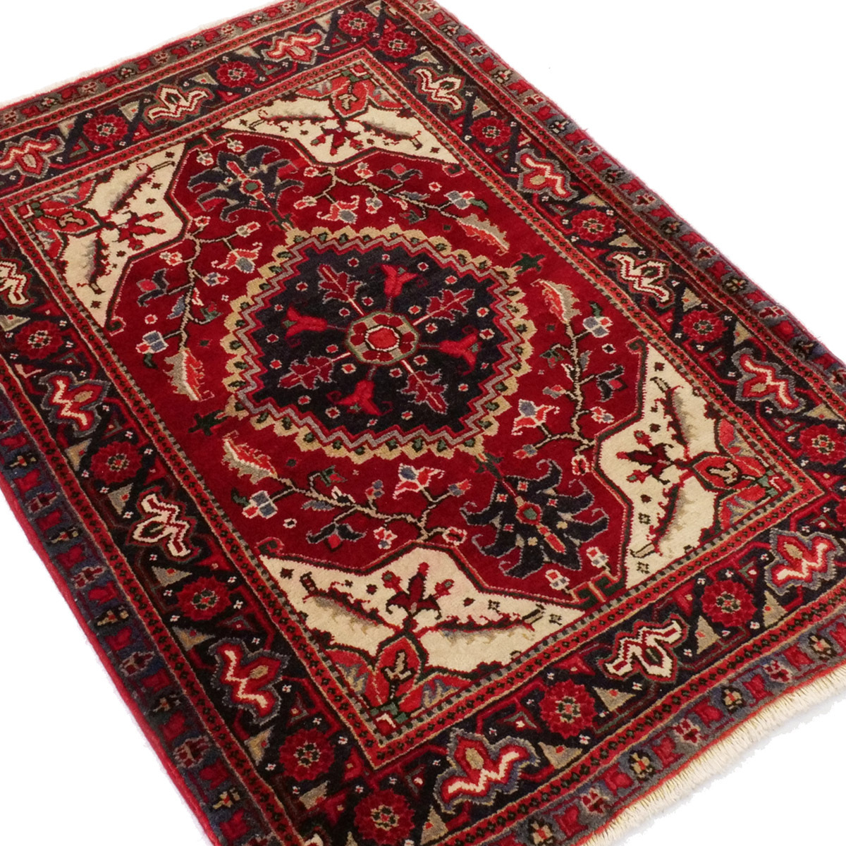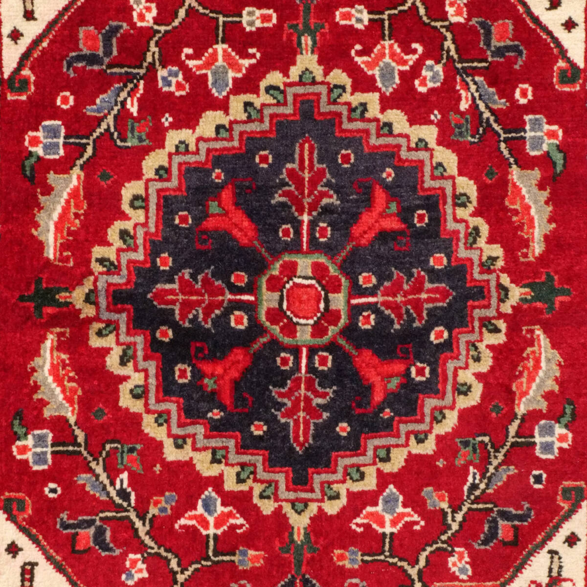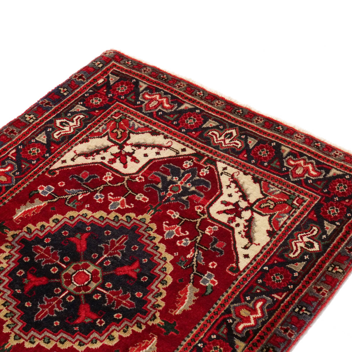 1950年代にへリーズ地方のシャラビアンによって織られたセミアンティークラグです。中央には濃紺の八角メダリオンが力強く配され、赤のフィールドに象徴的な花柄と枝模様が広がります。四隅には生成りのコーナー装飾が入り、コントラストの効いた伝統的な構成です。