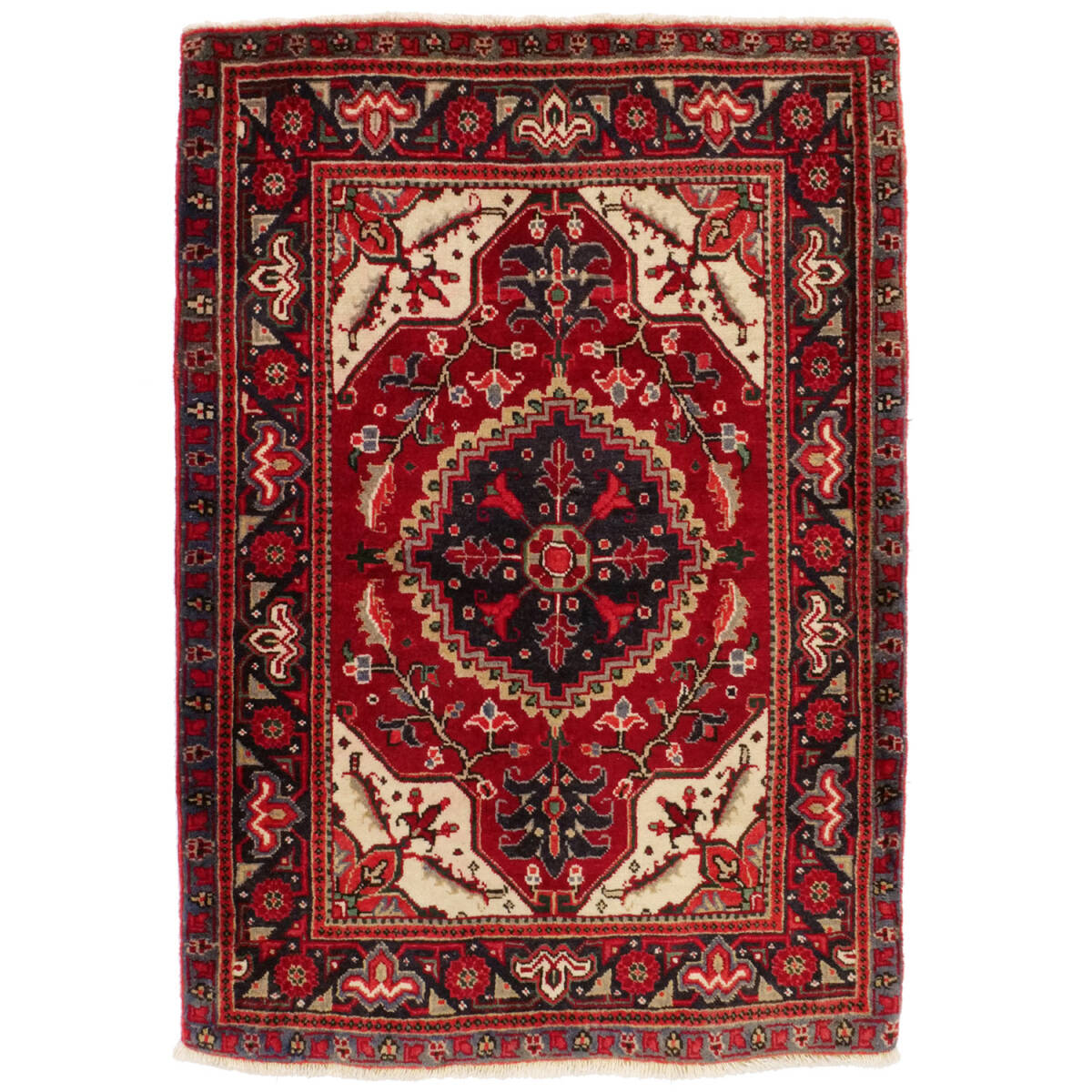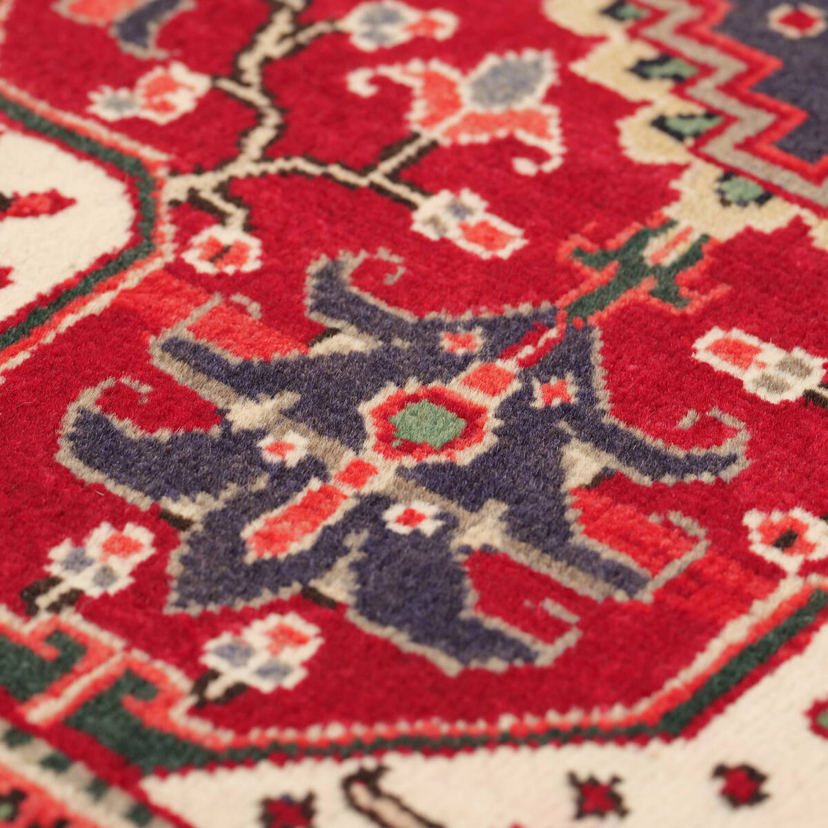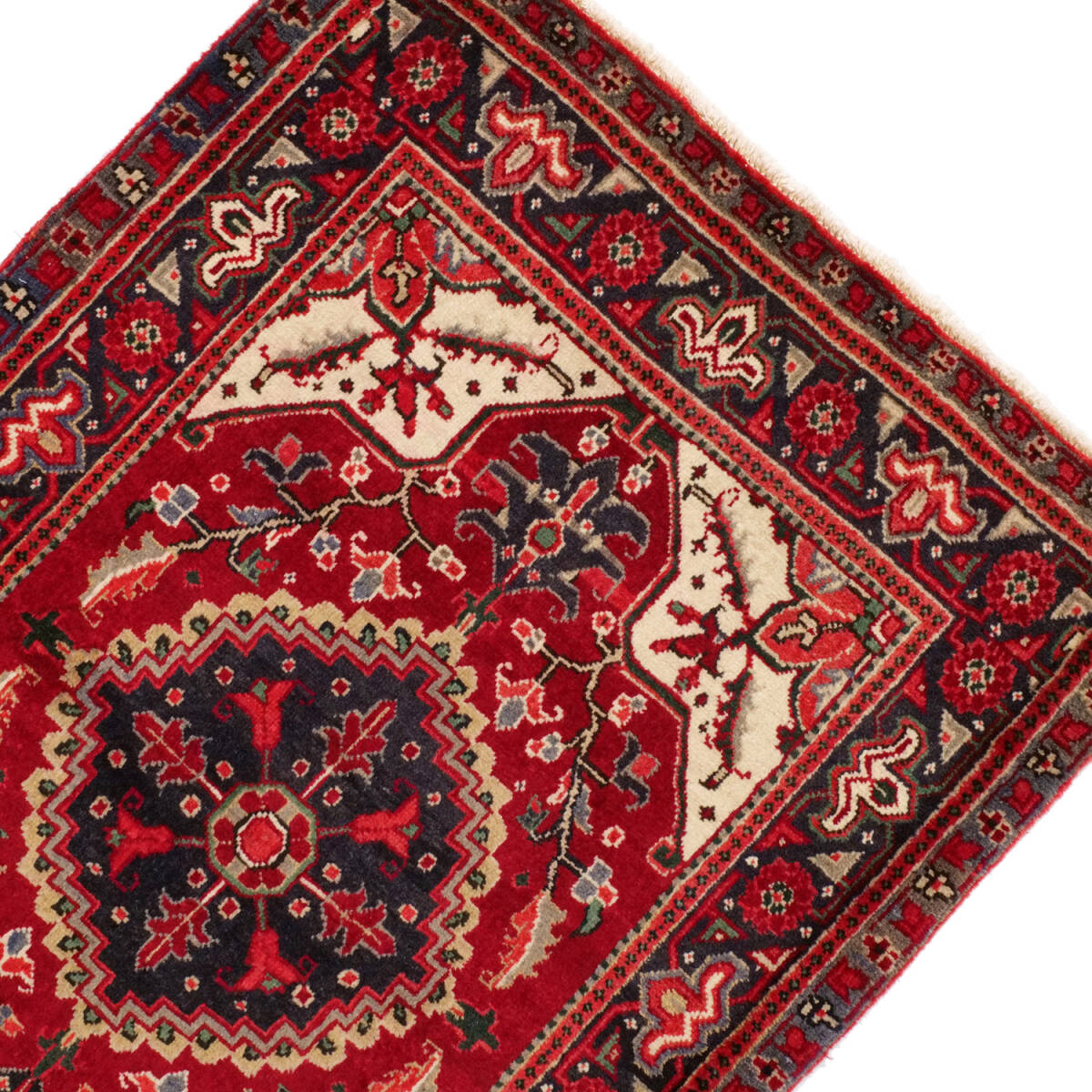 1950年代にへリーズ地方のシャラビアンによって織られたセミアンティークラグです。中央には濃紺の八角メダリオンが力強く配され、赤のフィールドに象徴的な花柄と枝模様が広がります。四隅には生成りのコーナー装飾が入り、コントラストの効いた伝統的な構成です。