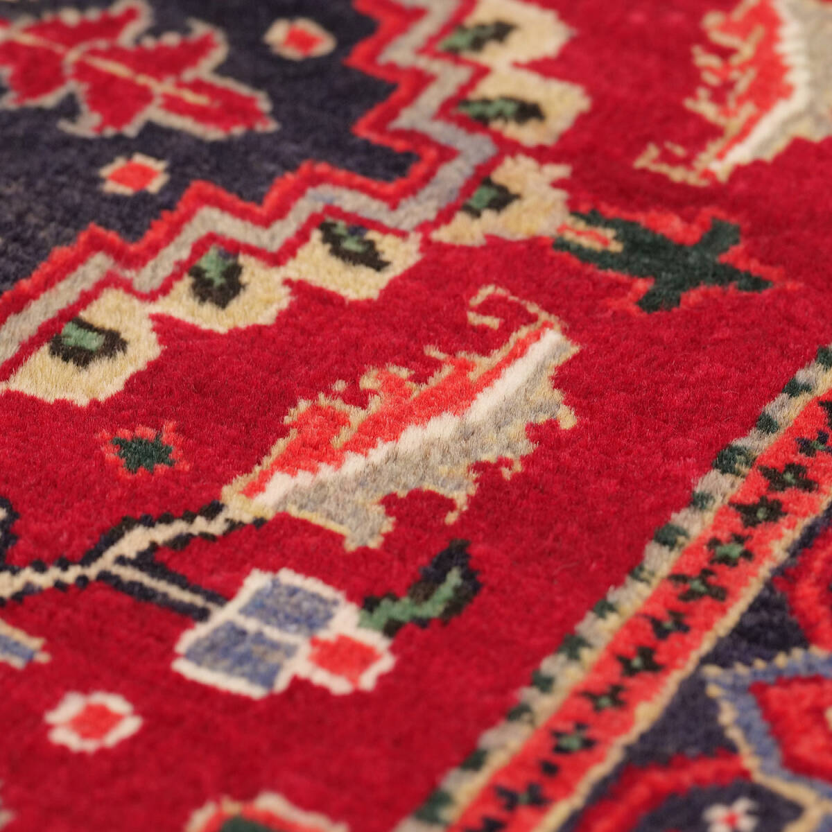へリーズ・シャラビアン産セミアンティーク。八角メダリオンと赤基調の力強い花文様が特徴の重厚な一枚です。