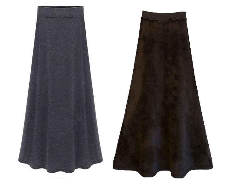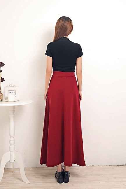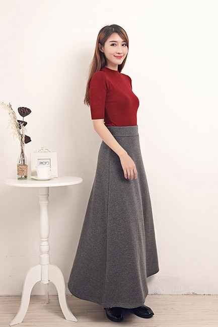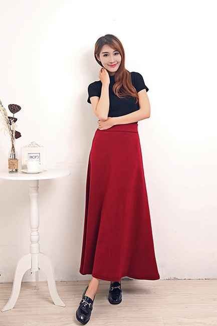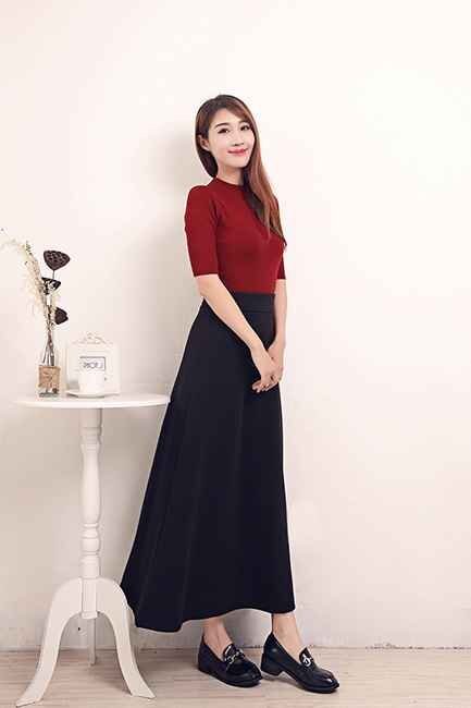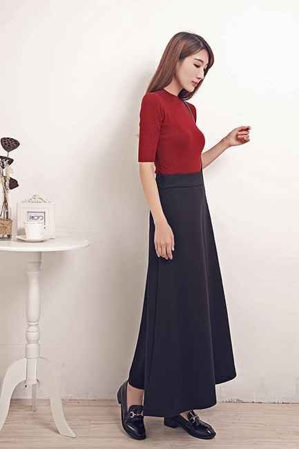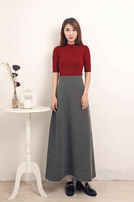 膝下まであるマキシ丈の上品なフレアスカートはハリのある素材なので、シルエットが品よくきまります。