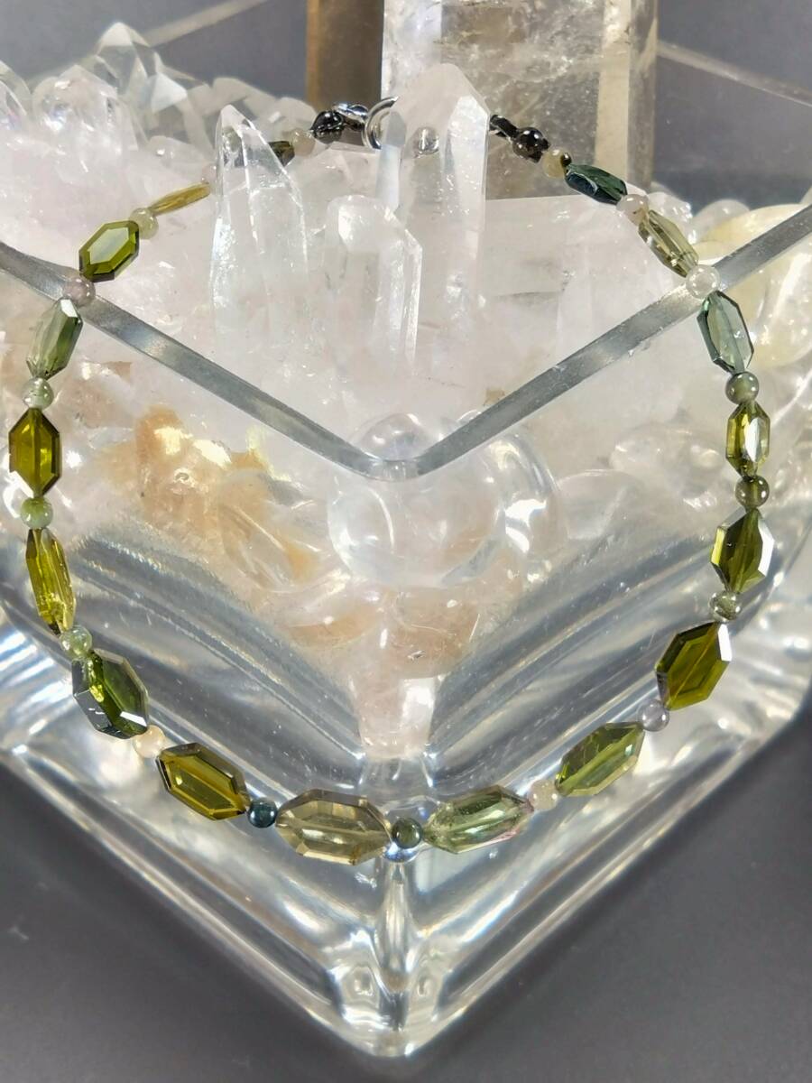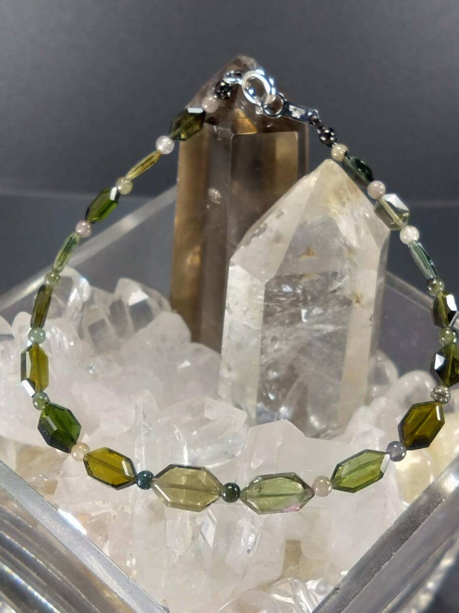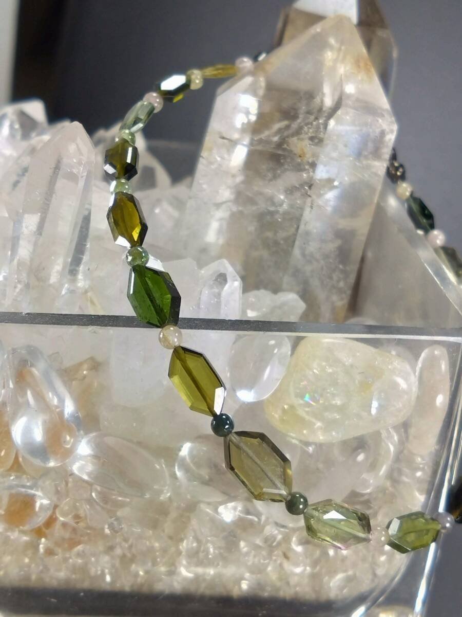 その中からほんとにいろいろな種類のトルマリンが使われていて見ていると時を忘れる程 魅入ってしまいます 特に今では大変珍しく手に入らない小さいですがカナリートルマリンやブルートルマリン 完璧ではないウォーターメロン等を使用していてコレクターの方には喜んでいただけると思います 長さも20㎝となっていますのでゆったりとした高級感溢れる長さにしてあります ドレスからTシャツまでどんな洋服でも対応できる感じにしてありますのでコレクションの1つに加えてみてはいかがですか 特にお肌の上にのせますと最高の輝きと肌ざわりを感じる事が出来ます トルマリンで よく言われるのがマイナスイオンを作れる鉱石として 健康思考の方には絶賛の宝石になりますので この機会に試してみては如何ですか