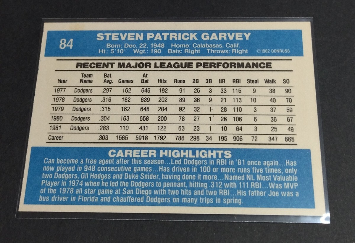 MLB 1982年Donruss スティーブ・ガービー(ドジャース) No,84。Dodgers STEVEN PATRICK GARVEY